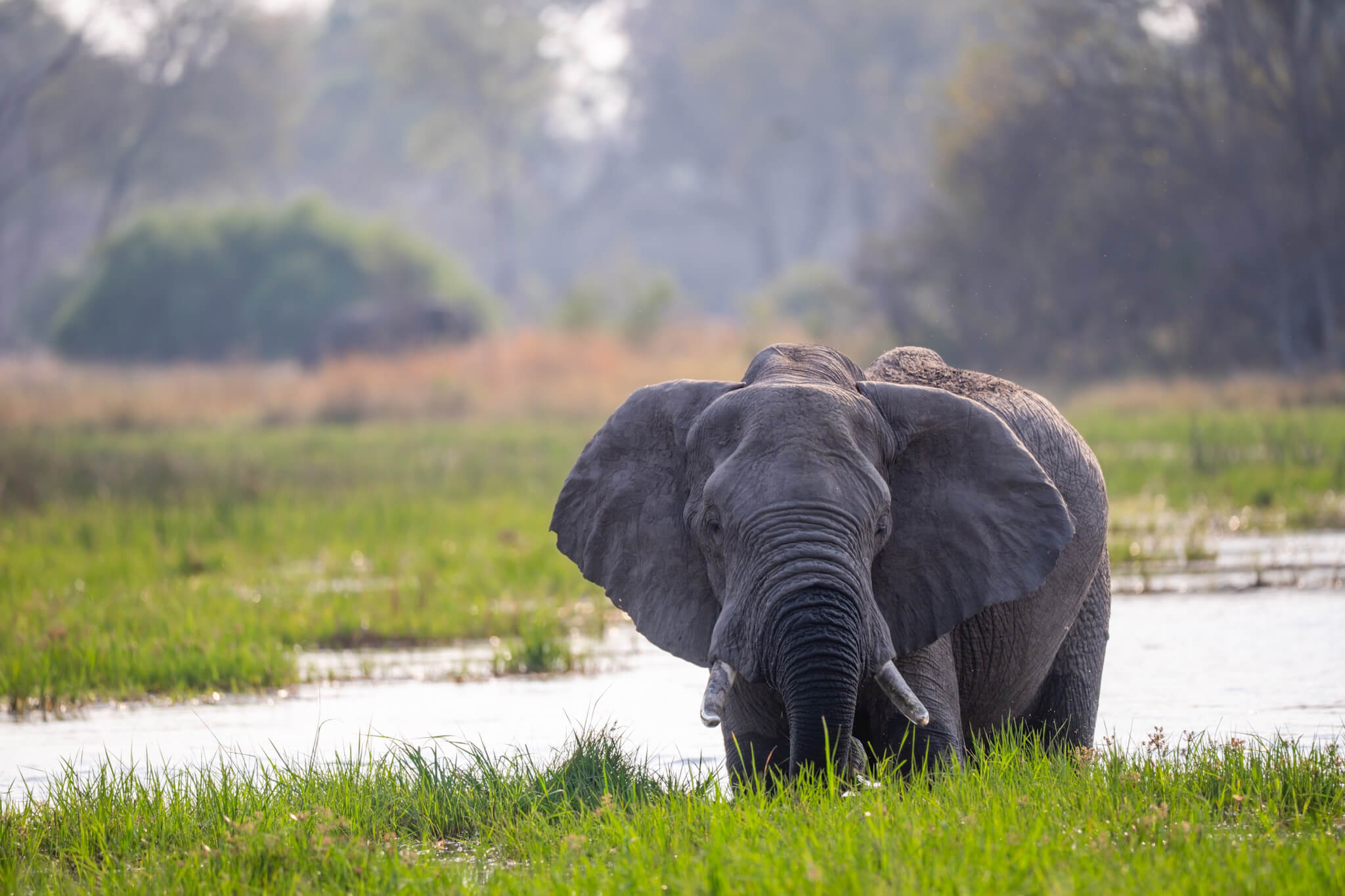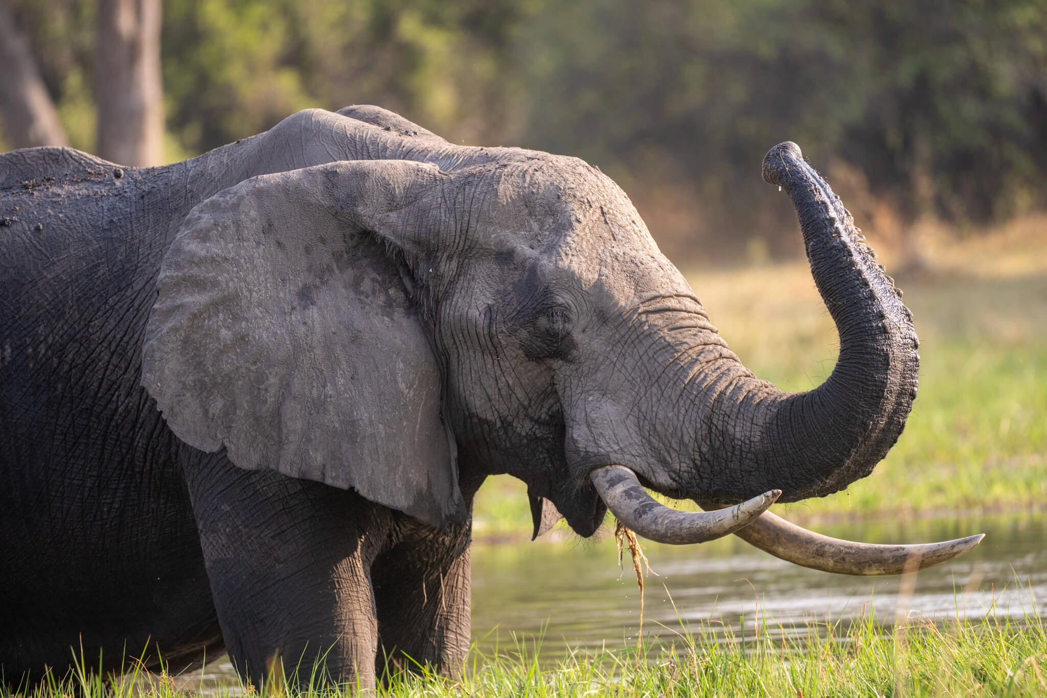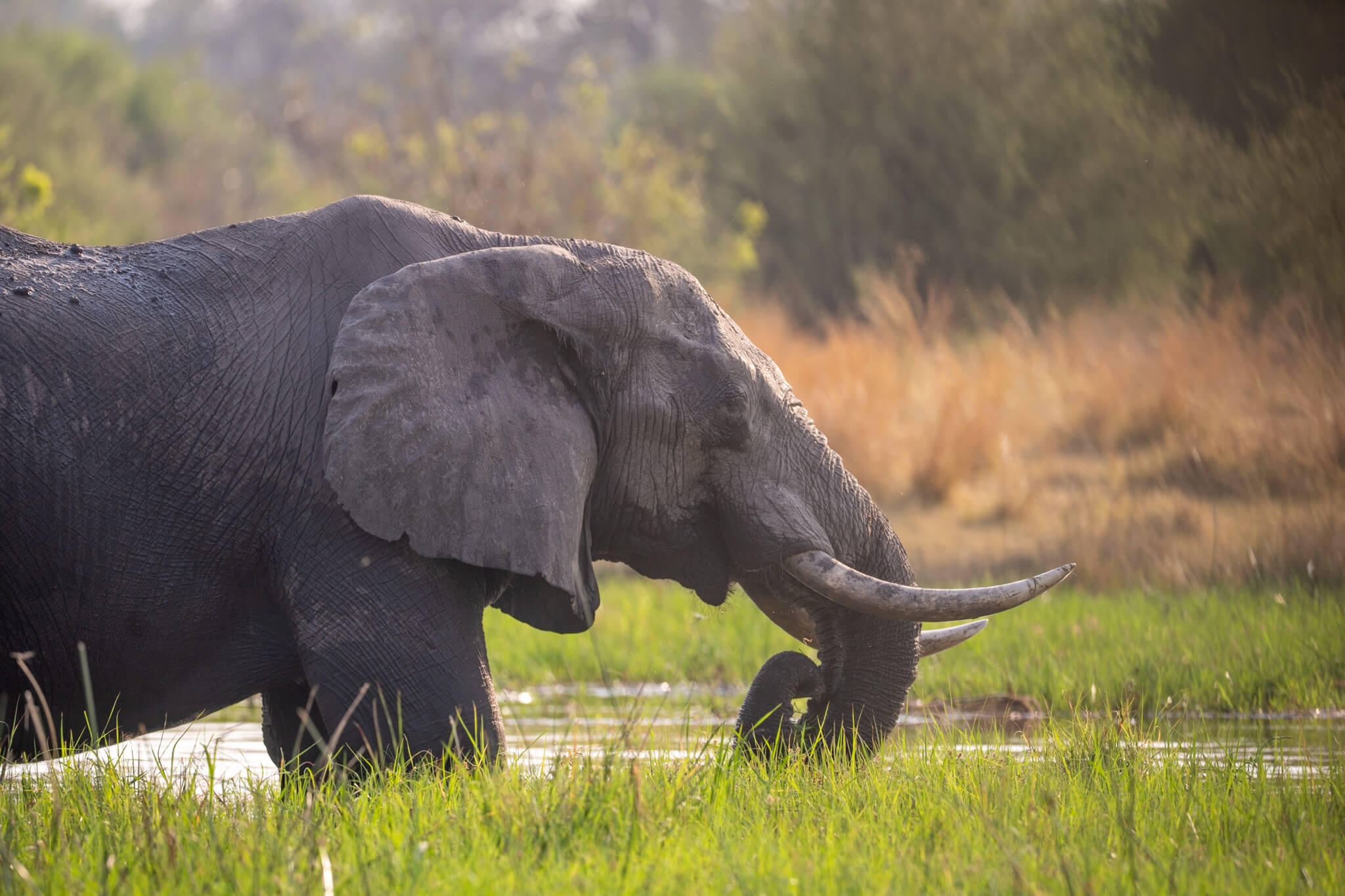 Die Tage waren geprägt von einer ganz wunderbaren Atmosphäre. Wir standen unter einem schattenspendenden grossen Baum, hörten viele Vögel und hatten mit dem Fluss ein Ruhe ausstrahlendes Sujet vor der Nase. Im Normalfall erhielten wir ab dem späten Vormittag Besuch von Elefantenbullen, die gemütlich durch den Fluss wateten und sich das Gras im Fluss schmecken liessen.