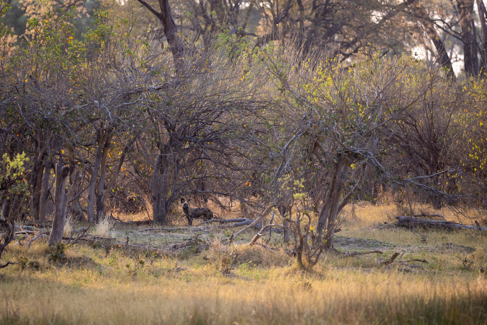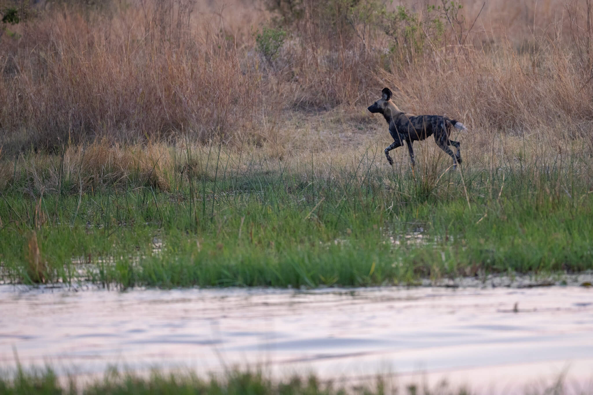 Die Ruhe war allerdings trügerisch. Am dritten Tag, als wir auf der Campsite sassen und die andere Flussseite beobachteten, kam plötzlich ein Impala aus dem Busch geschossen. Es wurde von einem Wild Dog verfolgt. Das Impala hatte augenscheinlich Todesangst, nahm seinen Mut zusammen und sprang in den Fluss. Innerhalb weniger Sekunden schoss ein grosses Nilkrokodil aus dem Wasser und packte das Impala.Nach sehr kurzer Zeit war die Wasseroberfläche ruhig und nichts deutete auf das vorangegangene Geschehen hin. Das Impala kam nie wieder an die Oberfläche und auch vom Krokodil war nichts mehr zu sehen. Sichtlich irritiert starrte der Wild Dog noch ca. 10–20 Sekunden auf den Fluss, bevor er wieder im Busch verschwand.