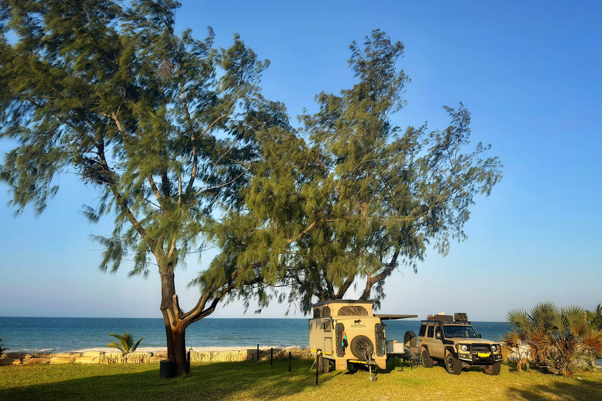 180 km südlich von Morrungulo liegt die Zavora Lodge. Dieser Ort war für uns eine strategische Wahl. Von dort aus ist es gut möglich, bis kurz vor Maputo zu fahren. Diese «Lodge» war bereits 2023 nicht im Bestzustand und das Bild, das sich 2025 ergab, war eine Katastrophe. Die Steilküste hat Teile der Infrastruktur abgetragen und das obere Camp war nur über eine provisorische Tiefsandpiste erreichbar. Mit Caravan bestand da keine Chance. Das Camp befand sich in einem sehr schlechten Zustand und es wimmelte vor Moskitos. Obwohl die Aussicht wirklich traumhaft war, verliessen wir den Ort am nächsten Morgen. Einen Plan, dort noch einmal einzukehren, haben wir nicht.