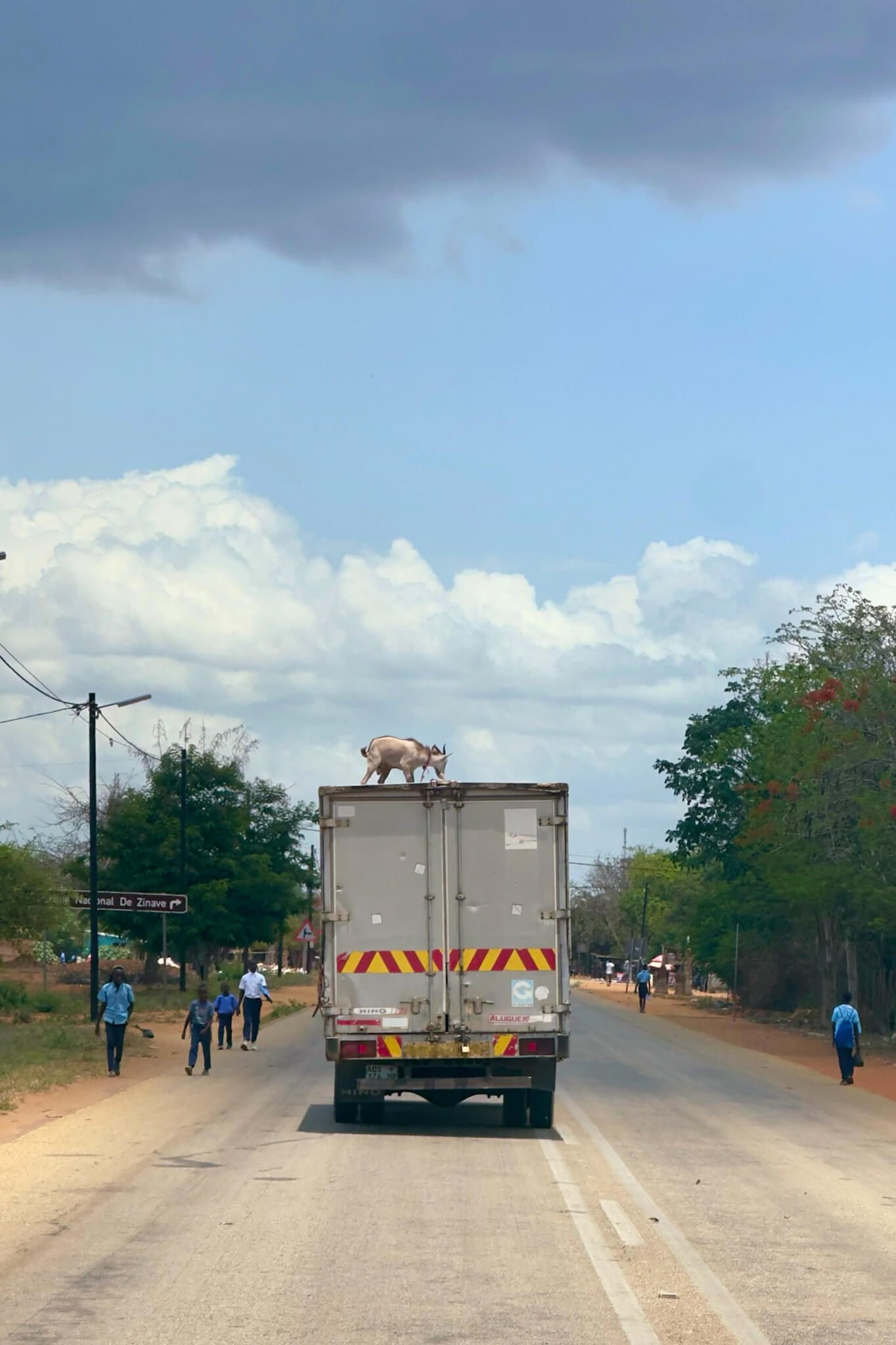 Wir blieben insgesamt 10 Nächte und haben uns im Nachhinein etwas geärgert, dass wir nicht noch länger geblieben waren. Der Tag bestand aus Baden im Indischen Ozean, Sonnenbaden im Camp, Laufen gehen, den Strand geniessen sowie Verhandlungen mit den Fischverkäufern führen und bei Erfolg frischen Fisch und Meeresfrüchte auf dem Grill zubereiten. Es gibt wirklich schlechtere Tagesabläufe. Nach den 10 Nächten verliessen wir Inhassoro, passierten die Halbinsel Inhambane und stoppten in Morrungulo. Unterwegs erblickten wir diese gängige Transportart für Ziegen.