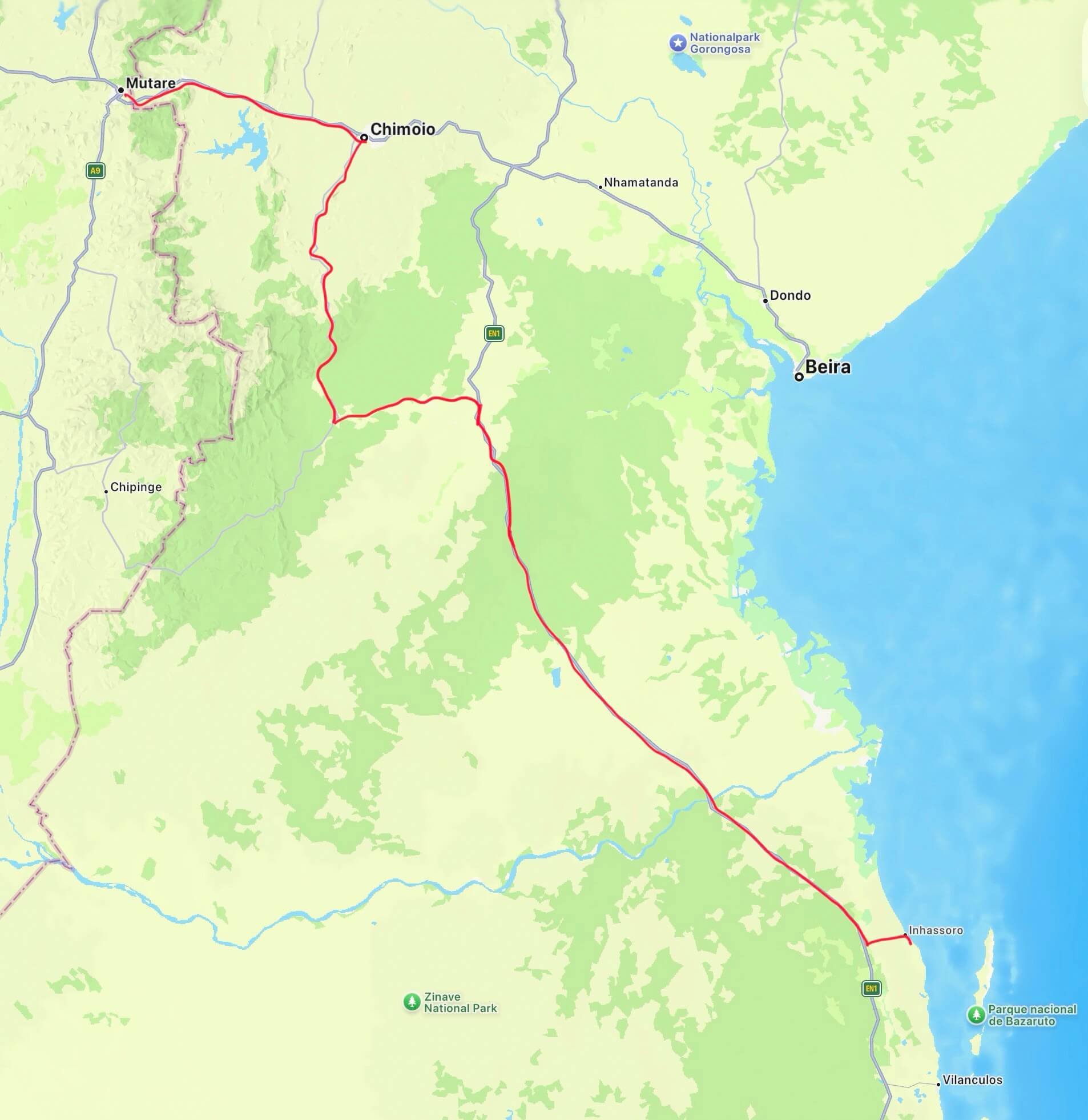 Der Weg führte uns über Manica bis kurz vor Chimoio. Dort verliessen wir die Hauptstrasse und bogen auf eine kleine Nebenstrasse ab (N260), die uns – auf bestem Asphalt – durch die Berge in Richtung Dombe führte. Diese Umfahrung machte viel Sinn. Die N1 von Inchope Richtung Süden besteht aus Potholes mit etwas Asphalt dazwischen und ist nahezu unfahrbar. Die von uns gewählte Umfahrung war toll. Die letzten etwa 50 km fuhren wir auf einer guten Schotterstrasse – vorher war alles asphaltiert und in gutem Zustand. Von Dombe führte uns die R520 auf die N1, der wir in südlicher Richtung folgten.
