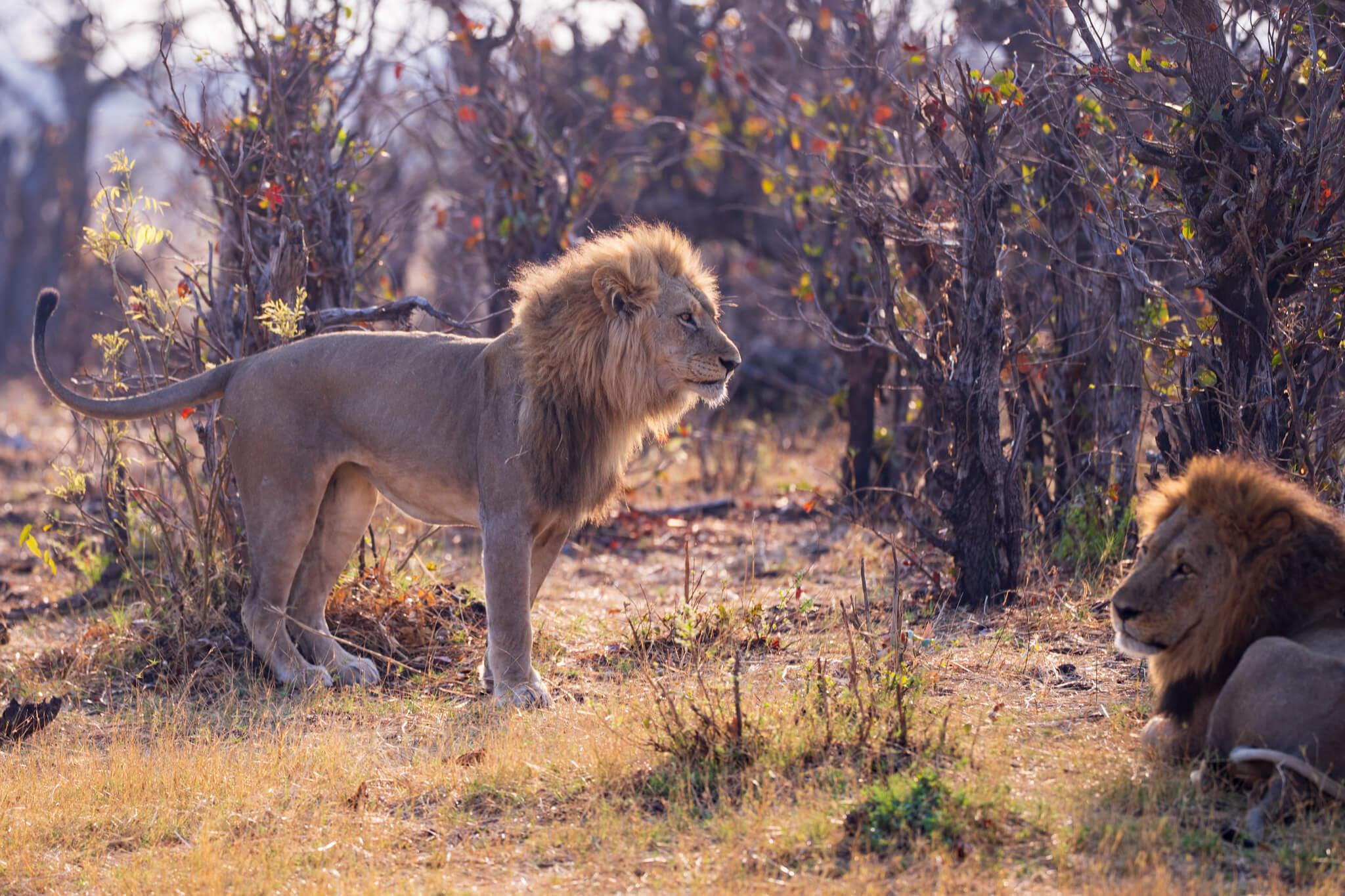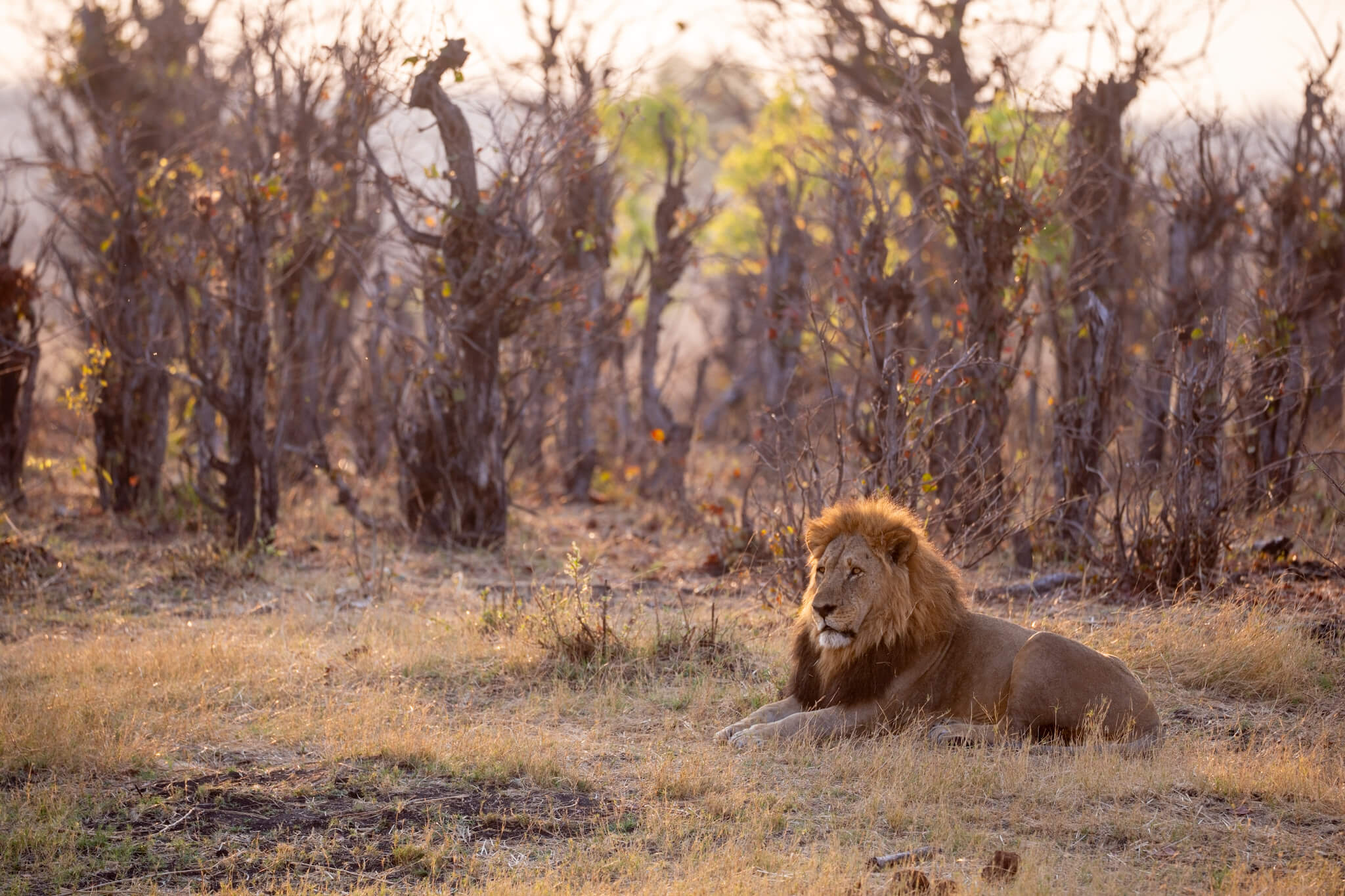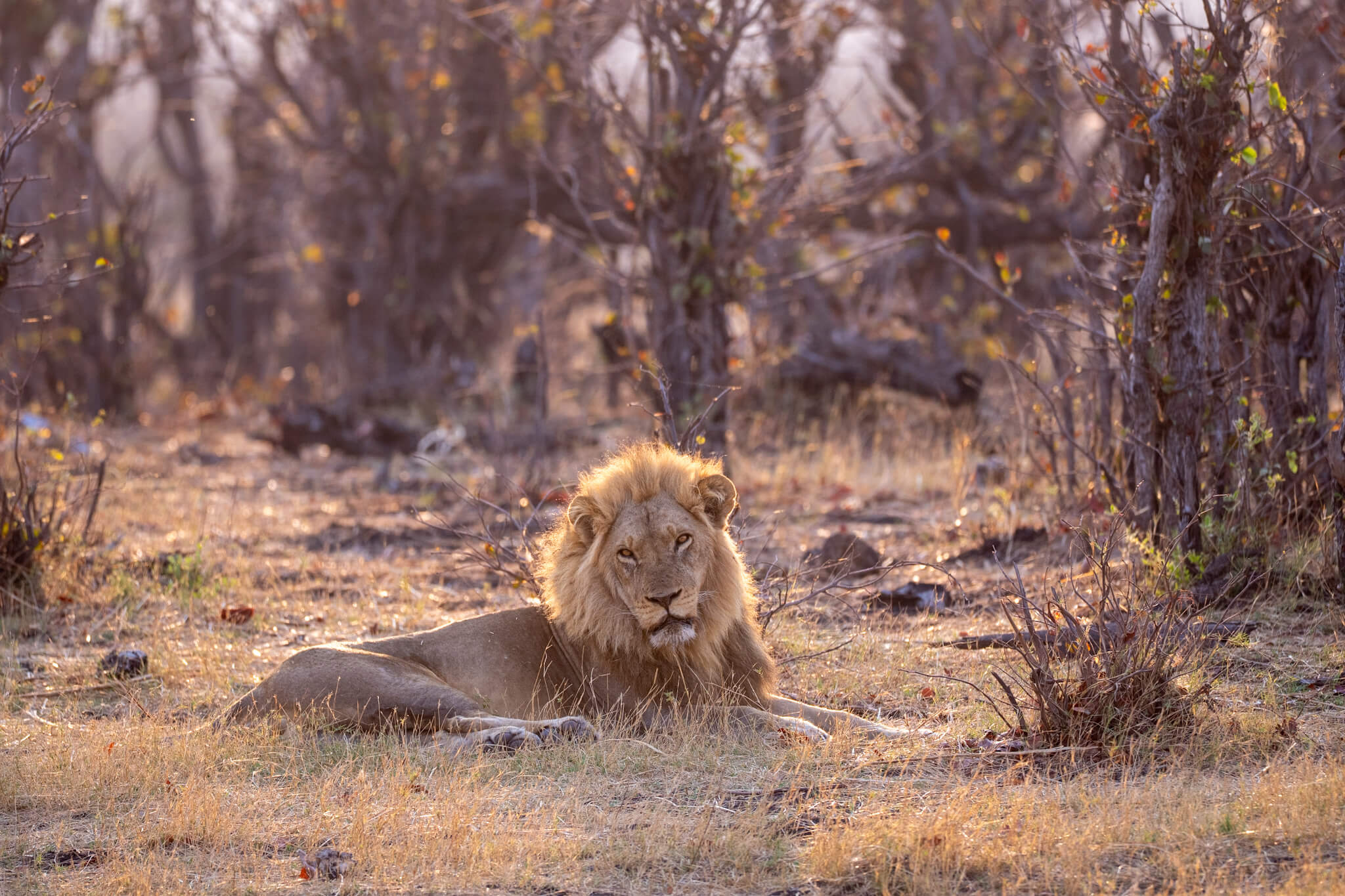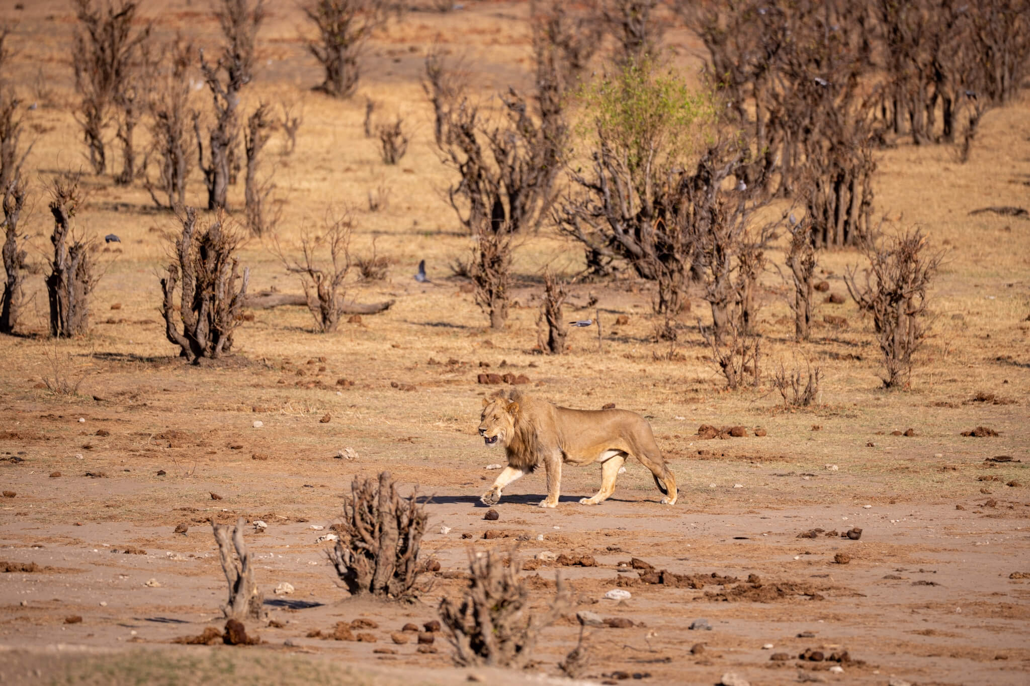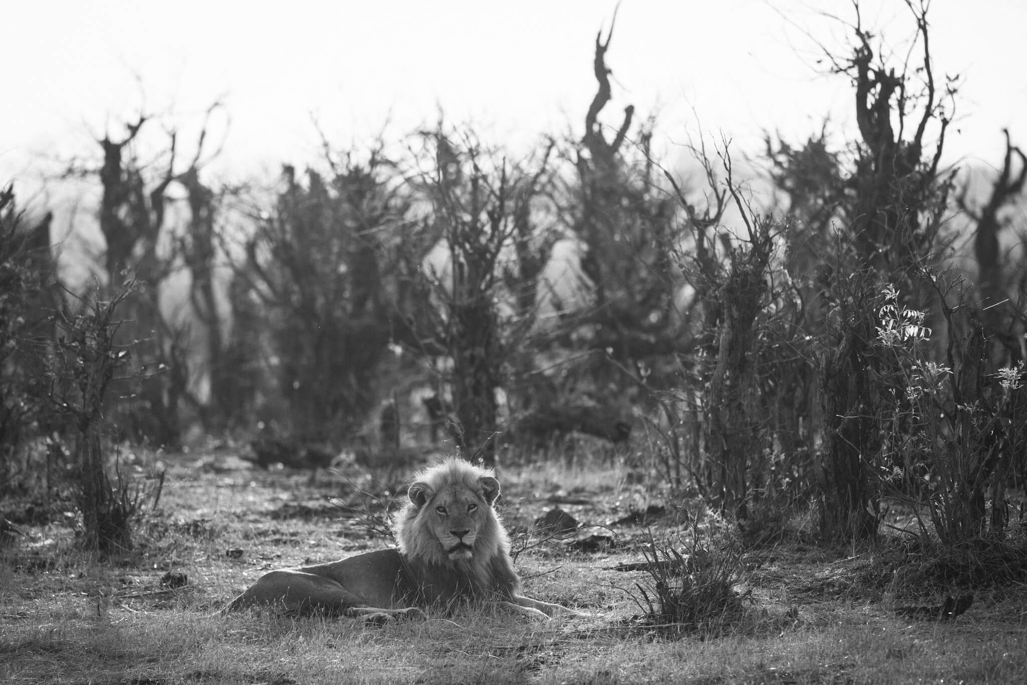 Ein weiterer Game Drive, der uns schliesslich doch zu Little Tom’s führte, entpuppte sich ebenfalls als Volltreffer. Dort erwartete uns eine Koalition aus zwei prächtigen Mähnenlöwen zusammen mit einer Löwin und drei Jungtieren. Am letzten Tag vor unserer Abreise aus Robins rundete ein Ausflug zum Deteema Dam unser Löwenglück ab: In einiger Entfernung zum Picnic Spot lag ein Mähnenlöwe im Schatten, während zwei Löwinnen mit Jungen umherzogen. Langsam bekamen wir den Eindruck, dass Hwange in dieser Saison ziemlich löwenlastig sein könnte.