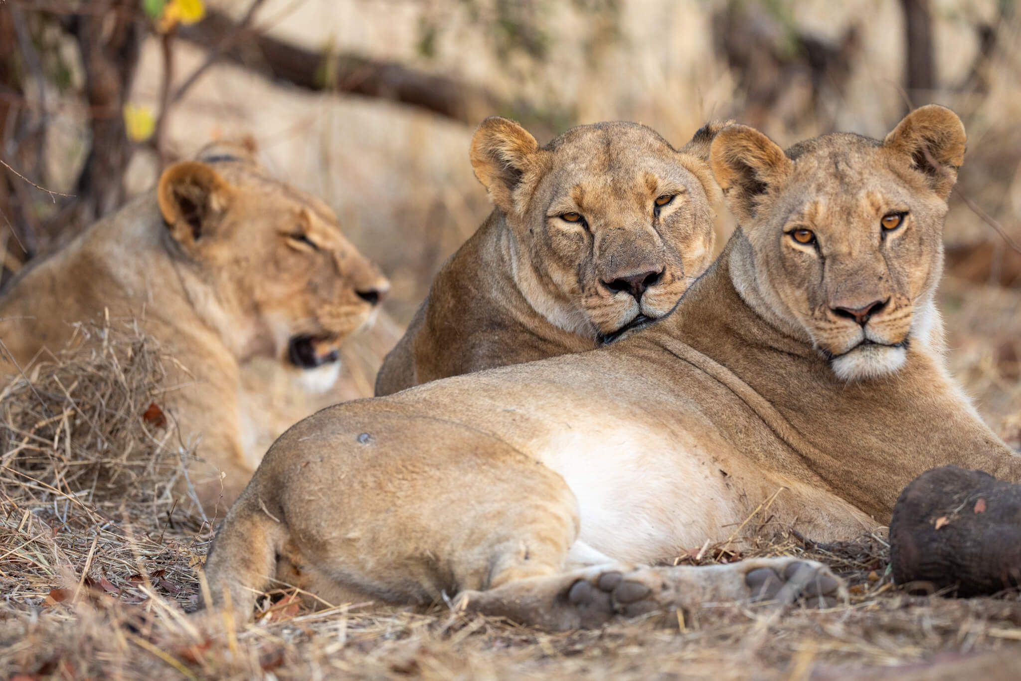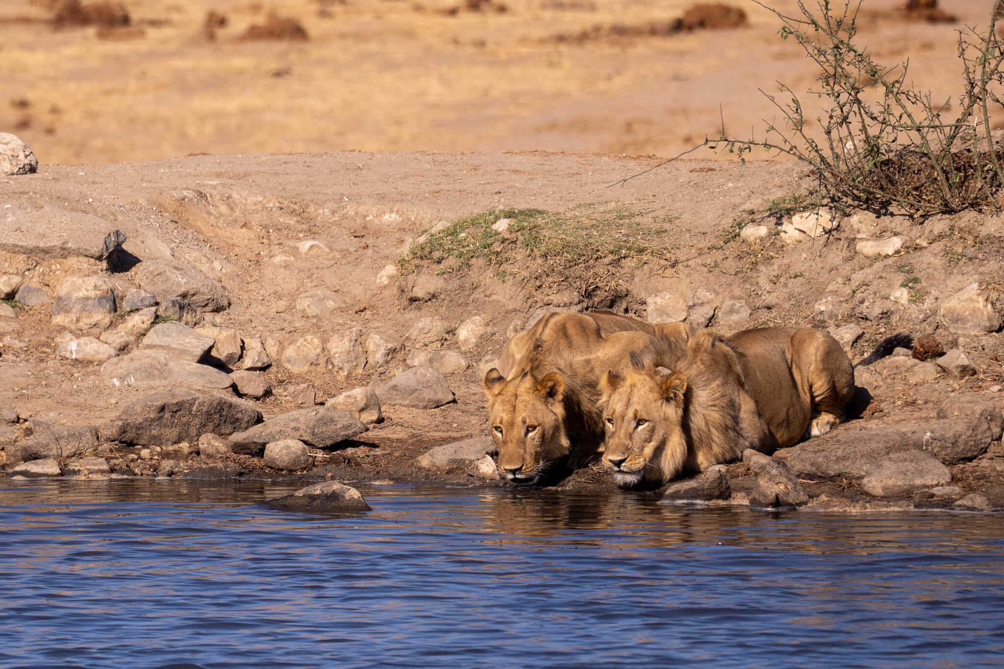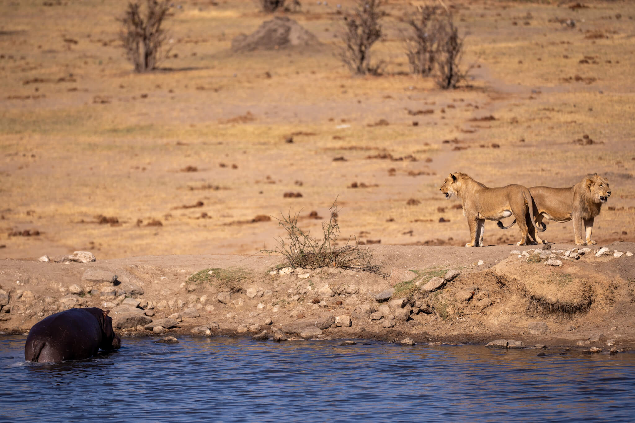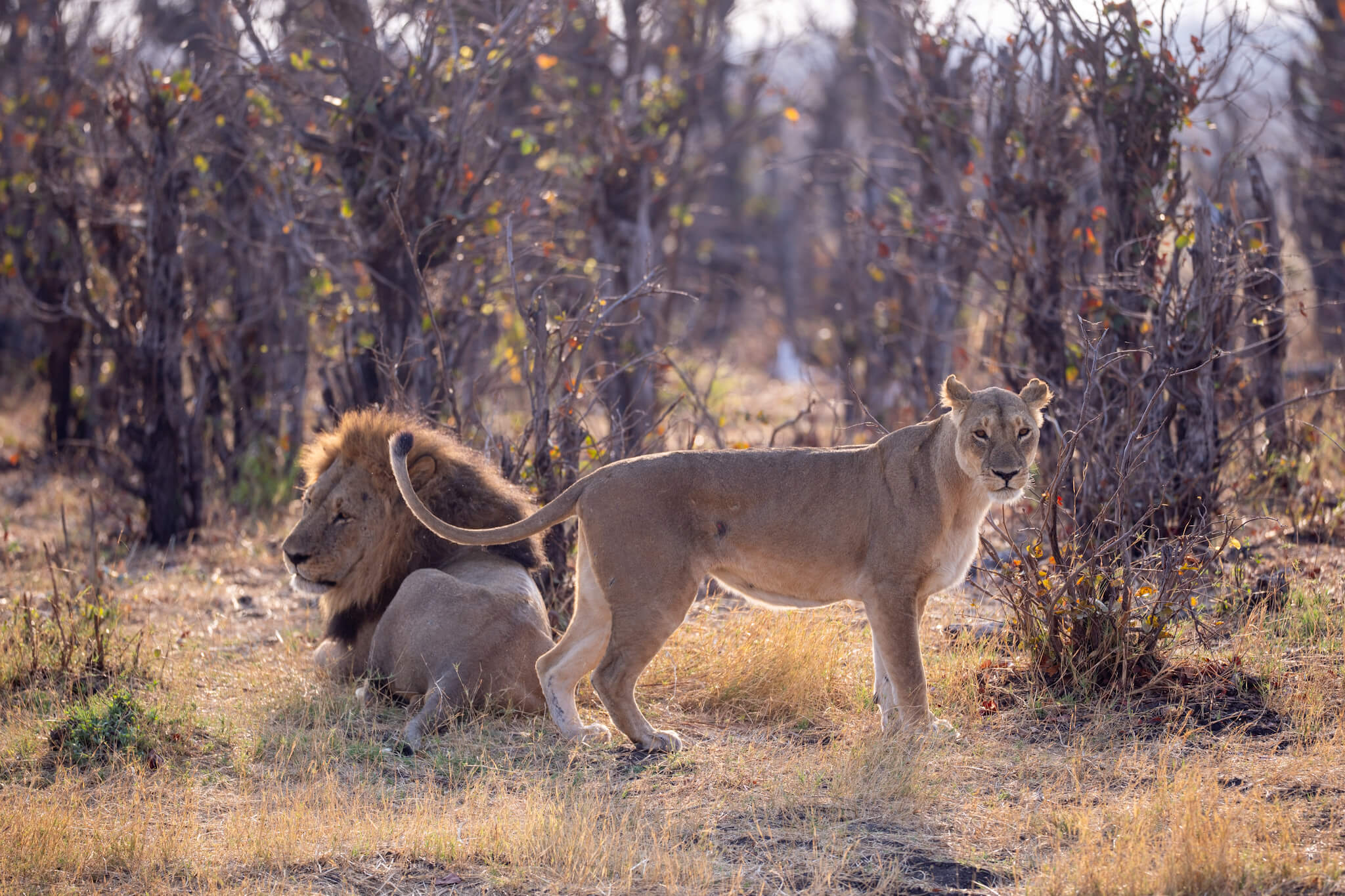 Ein weiterer Game Drive, der uns schliesslich doch zu Little Tom’s führte, entpuppte sich ebenfalls als Volltreffer. Dort erwartete uns eine Koalition aus zwei prächtigen Mähnenlöwen zusammen mit einer Löwin und drei Jungtieren. Am letzten Tag vor unserer Abreise aus Robins rundete ein Ausflug zum Deteema Dam unser Löwenglück ab: In einiger Entfernung zum Picnic Spot lag ein Mähnenlöwe im Schatten, während zwei Löwinnen mit Jungen umherzogen. Langsam bekamen wir den Eindruck, dass Hwange in dieser Saison ziemlich löwenlastig sein könnte.