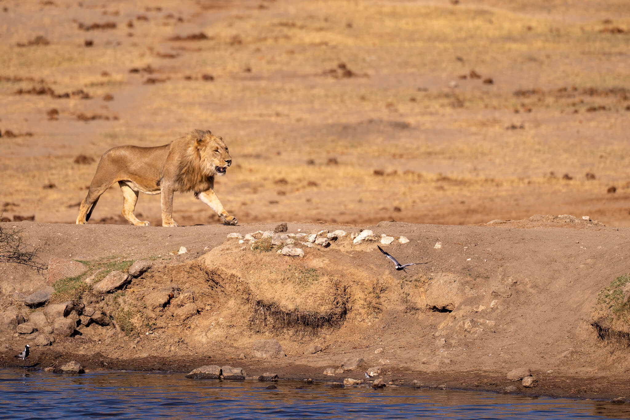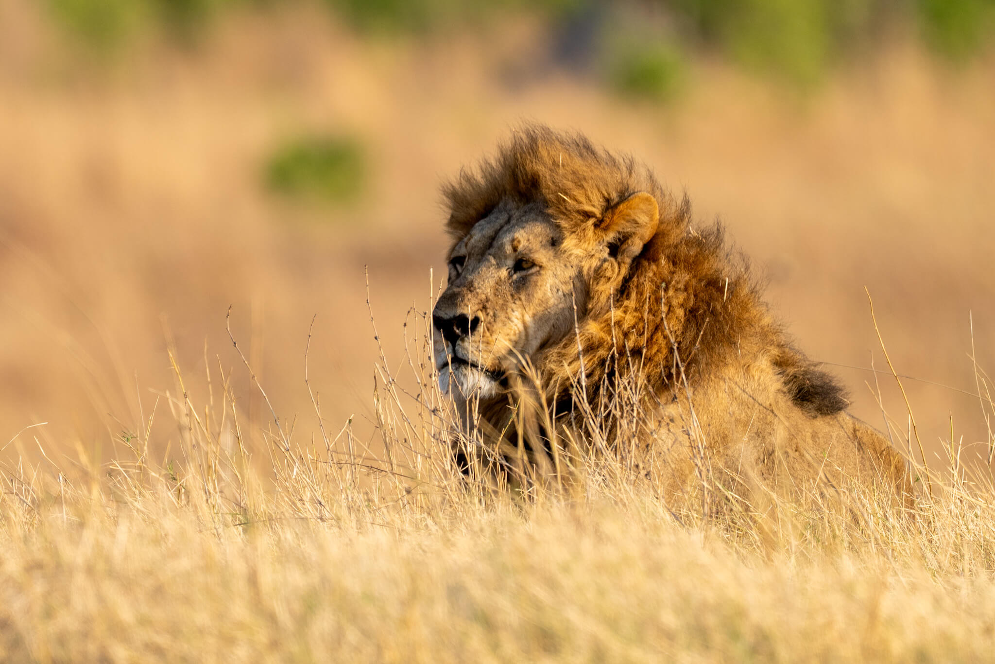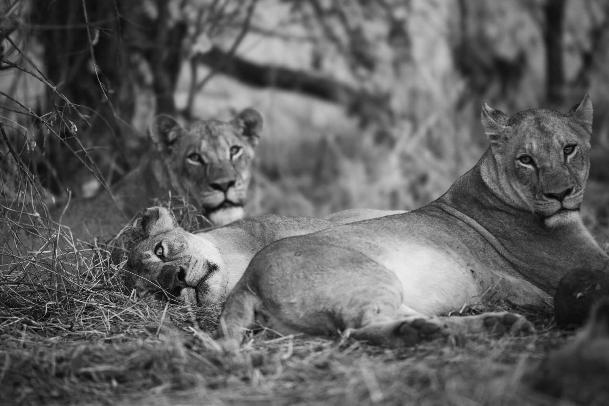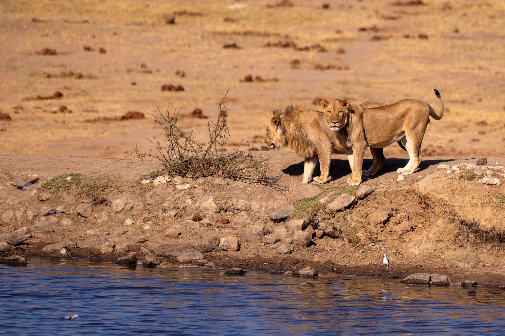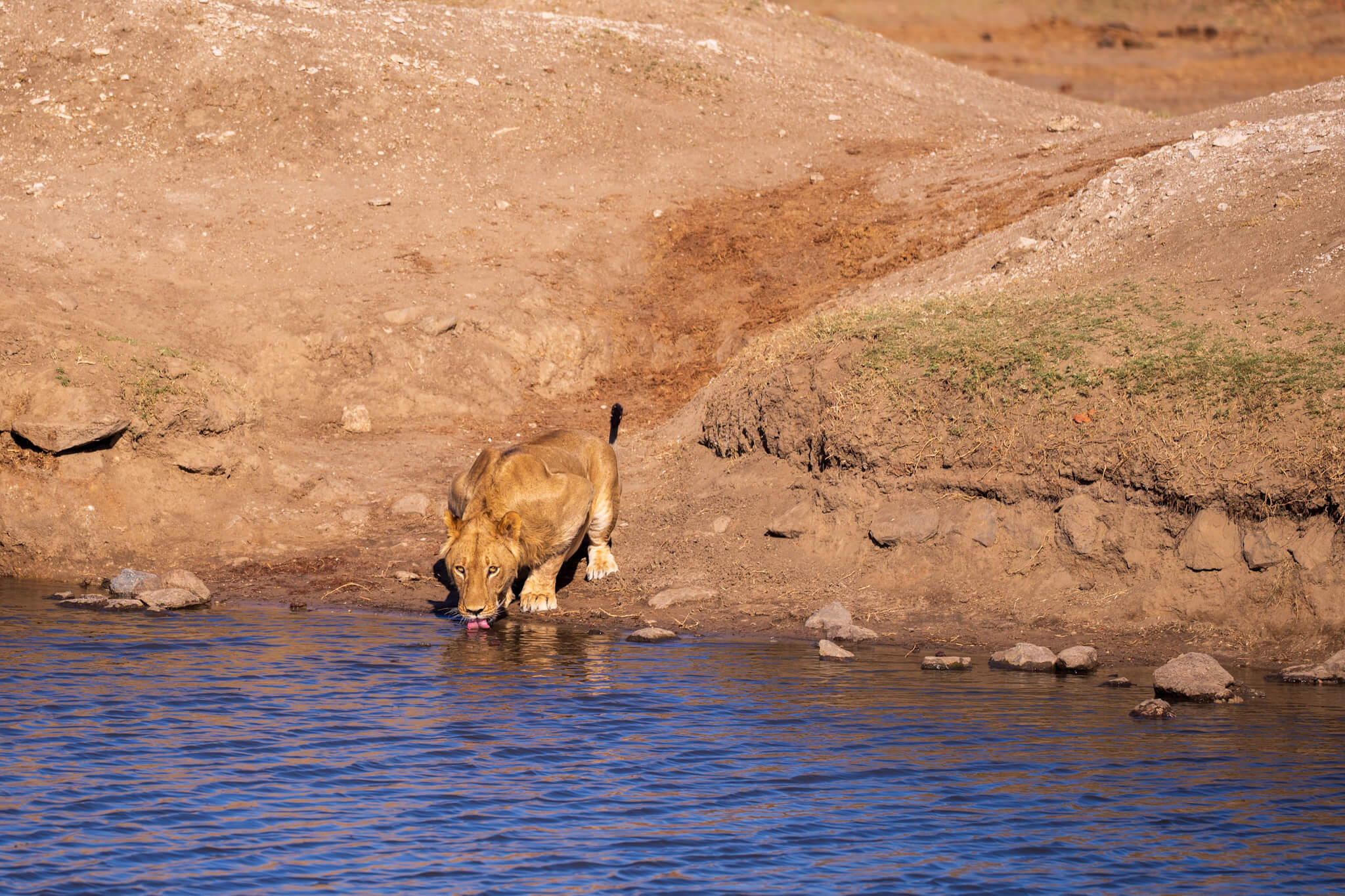 Ein weiterer Game Drive, der uns schliesslich doch zu Little Tom’s führte, entpuppte sich ebenfalls als Volltreffer. Dort erwartete uns eine Koalition aus zwei prächtigen Mähnenlöwen zusammen mit einer Löwin und drei Jungtieren. Am letzten Tag vor unserer Abreise aus Robins rundete ein Ausflug zum Deteema Dam unser Löwenglück ab: In einiger Entfernung zum Picnic Spot lag ein Mähnenlöwe im Schatten, während zwei Löwinnen mit Jungen umherzogen. Langsam bekamen wir den Eindruck, dass Hwange in dieser Saison ziemlich löwenlastig sein könnte.