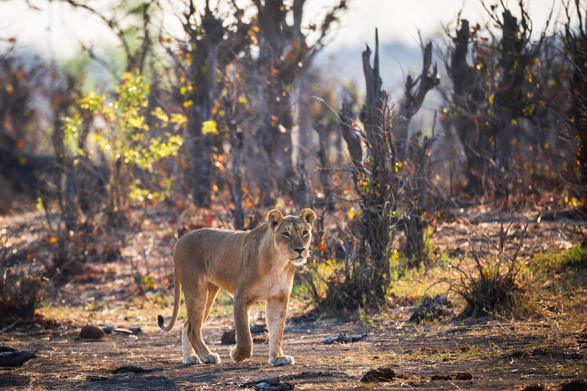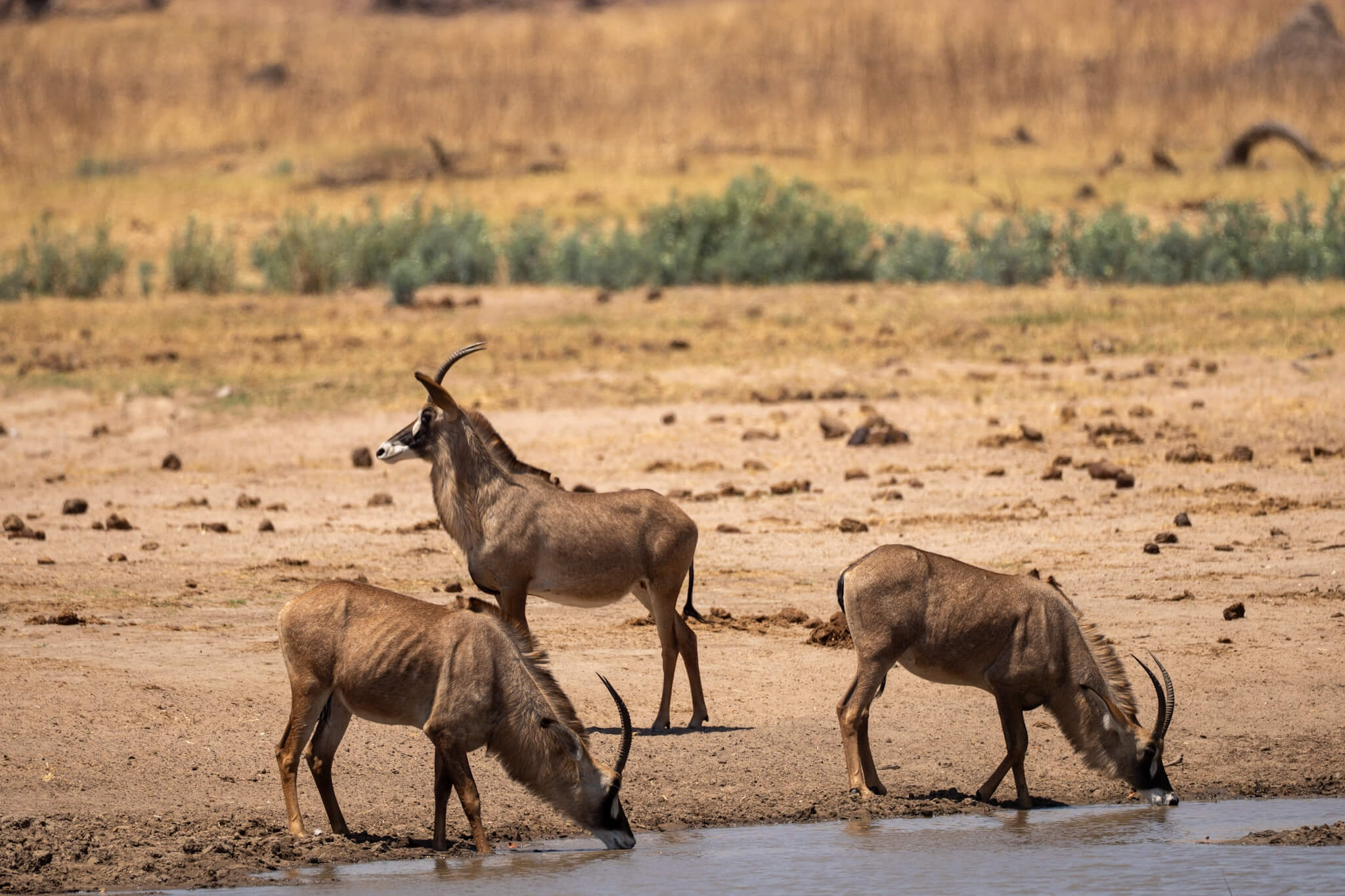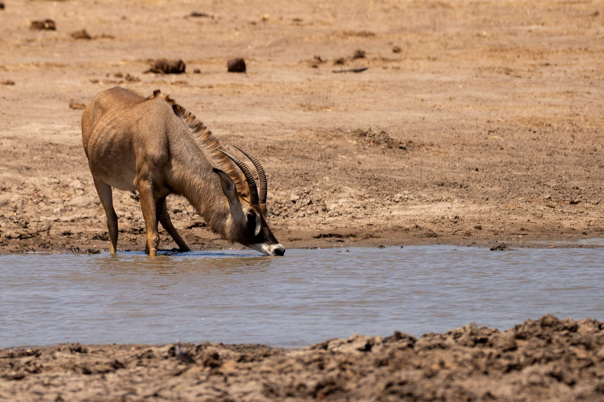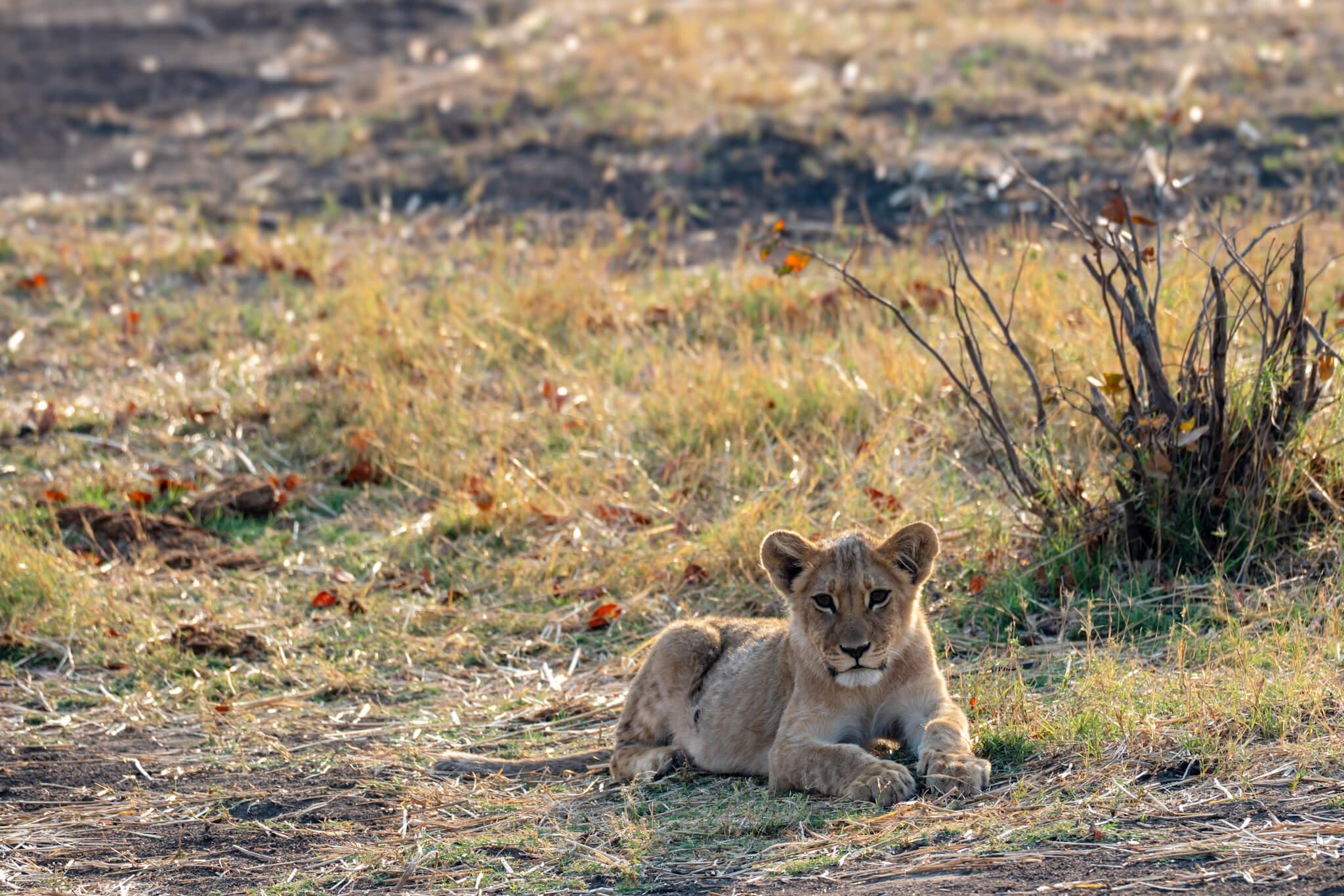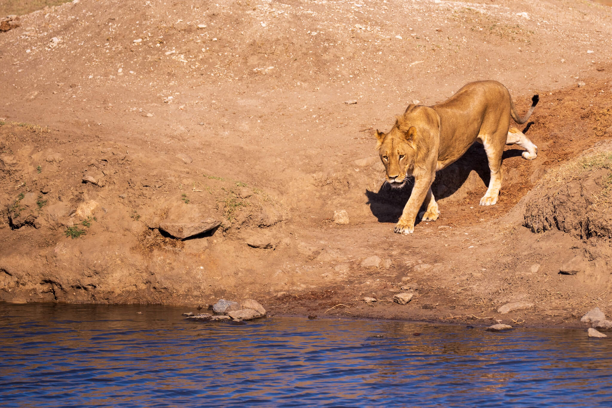 Ein weiterer Game Drive, der uns schliesslich doch zu Little Tom’s führte, entpuppte sich ebenfalls als Volltreffer. Dort erwartete uns eine Koalition aus zwei prächtigen Mähnenlöwen zusammen mit einer Löwin und drei Jungtieren. Am letzten Tag vor unserer Abreise aus Robins rundete ein Ausflug zum Deteema Dam unser Löwenglück ab: In einiger Entfernung zum Picnic Spot lag ein Mähnenlöwe im Schatten, während zwei Löwinnen mit Jungen umherzogen. Langsam bekamen wir den Eindruck, dass Hwange in dieser Saison ziemlich löwenlastig sein könnte.