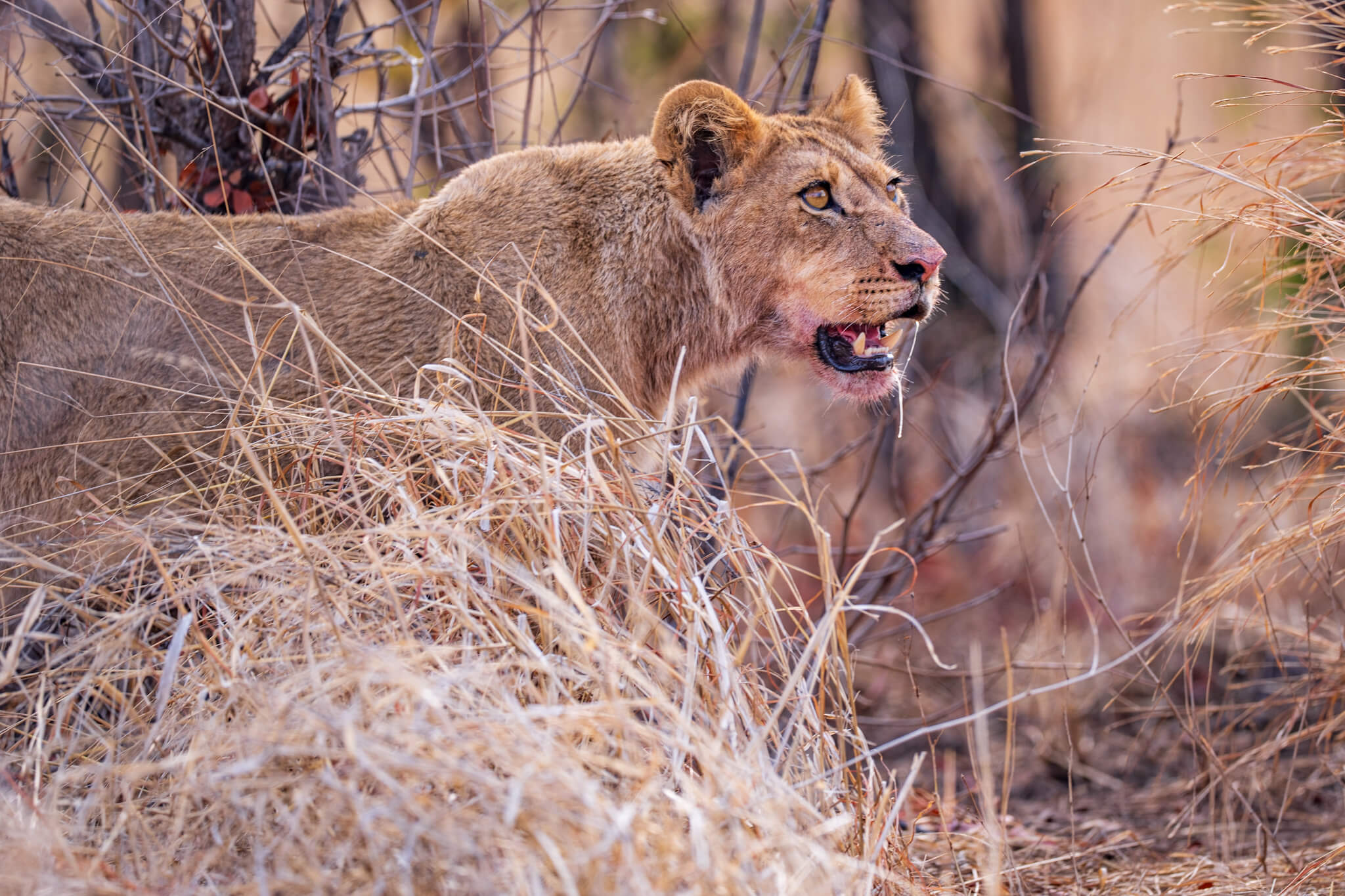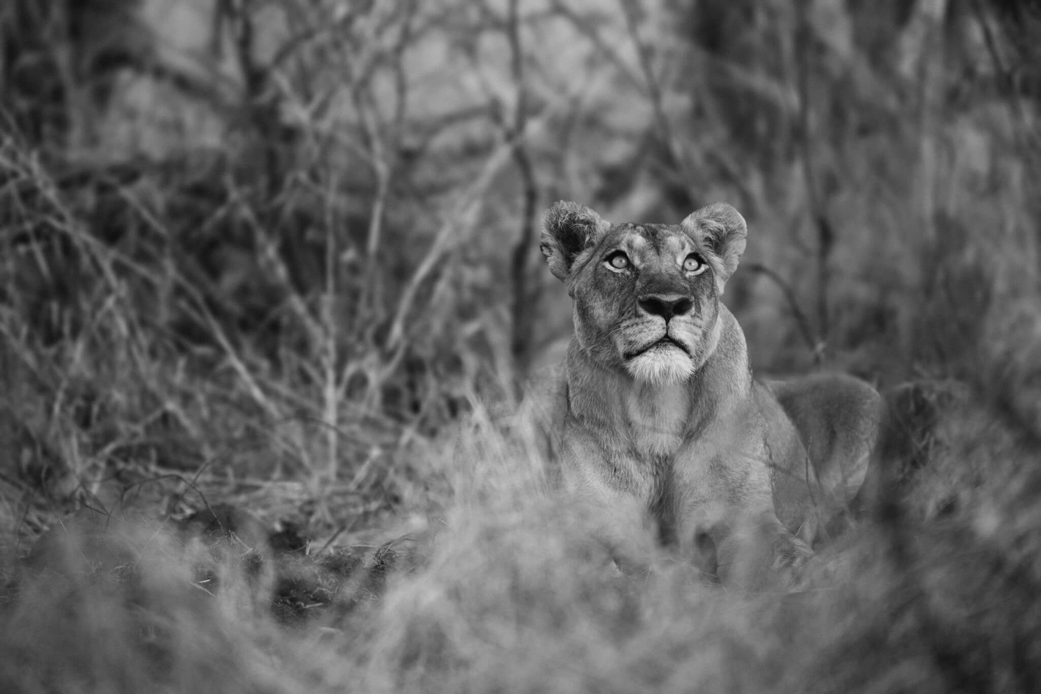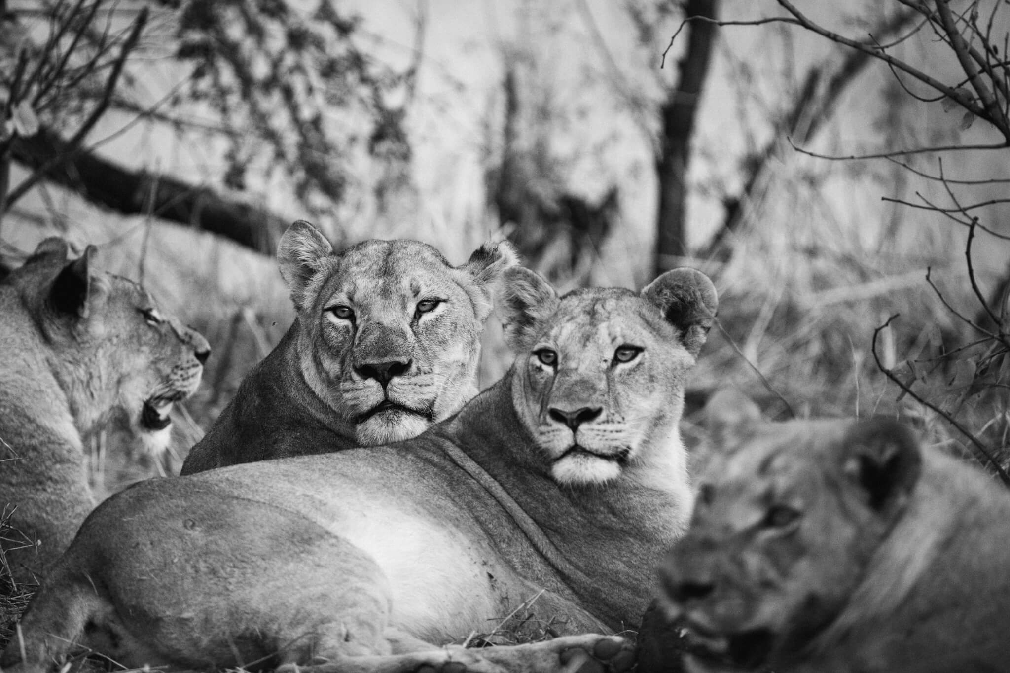 Nachdem wir uns eingerichtet hatten, starteten wir zu unserem ersten Game Drive. Eigentlich wollten wir nur einen kurzen, gemütlichen Abstecher zum Little Tom’s Wasserloch machen und dann zurückkehren. Daraus wurde nichts. Schon wenige Kilometer nach Verlassen des Robins Camp entdeckten wir ein Löwenrudel im Gebüsch direkt neben der Strasse – es machte sich gerade über einen Elefanten her. Wie wir später erfuhren, hatte das achtköpfige Rudel in der Nacht vor unserer Ankunft einen halbstarken Elefanten erlegt. Die acht Löwen wirkten ausgehungert.