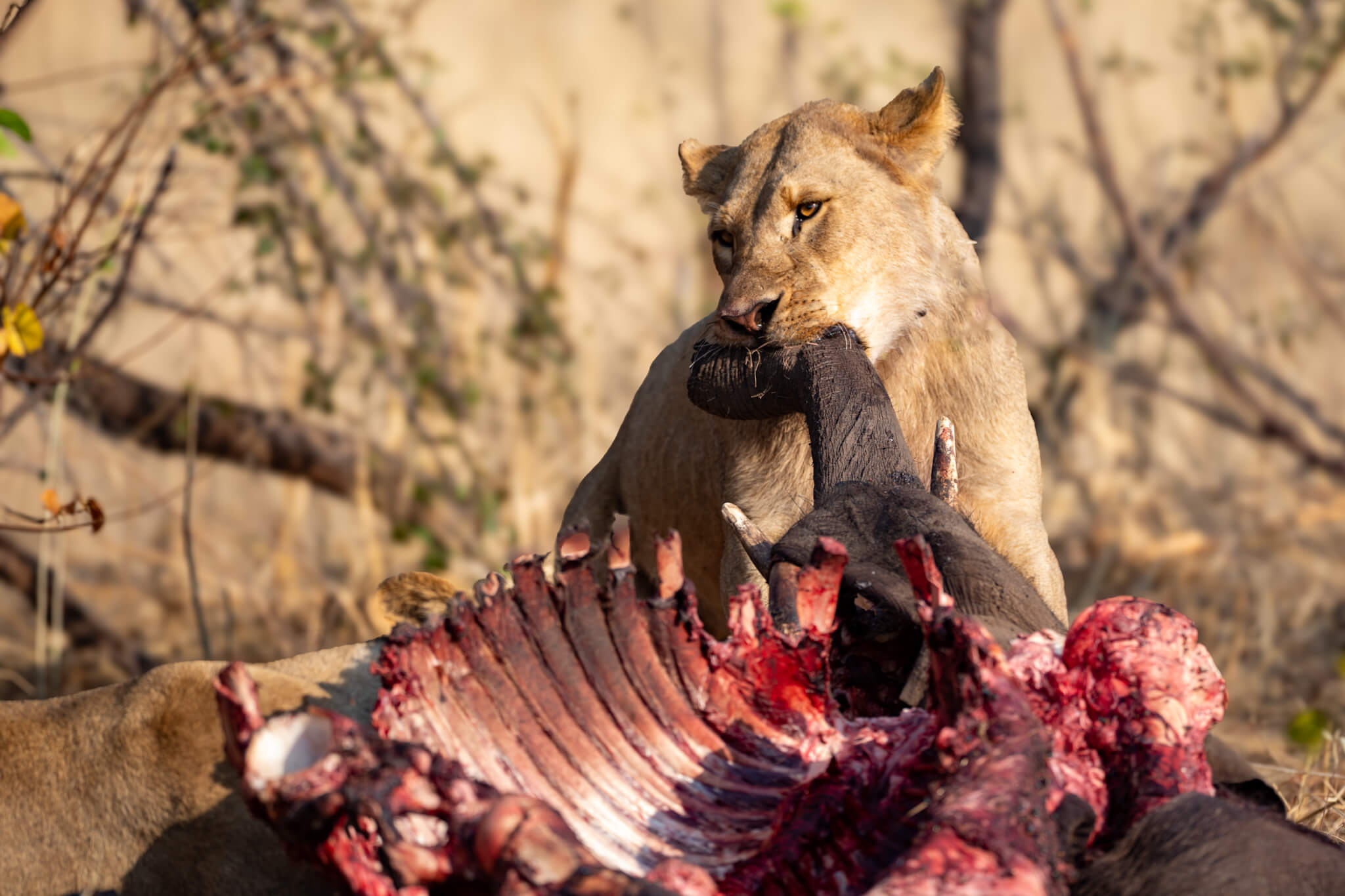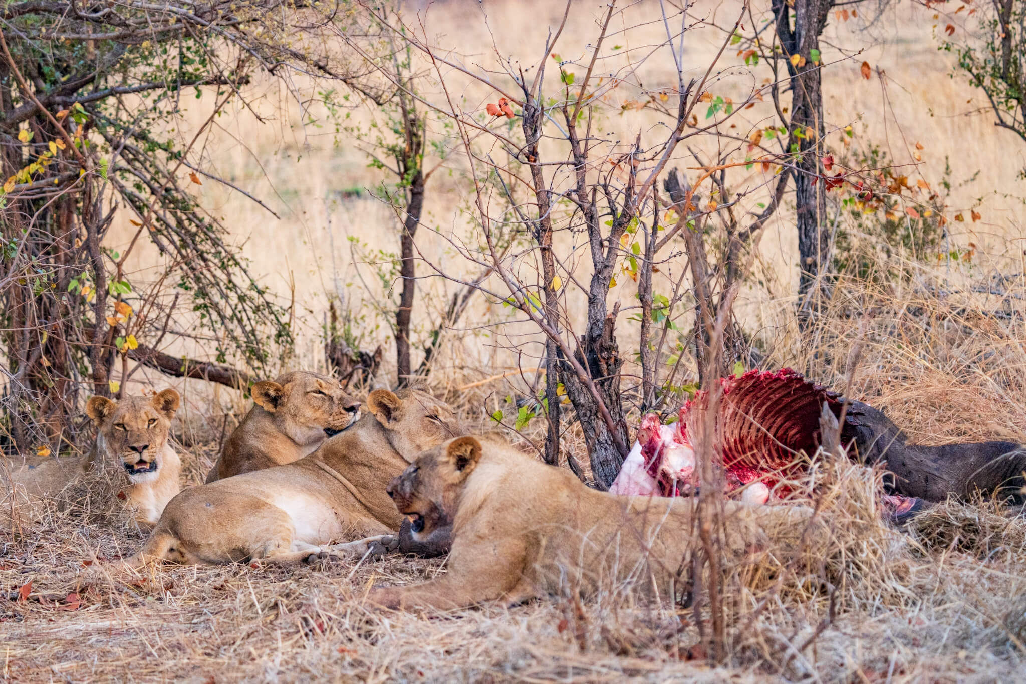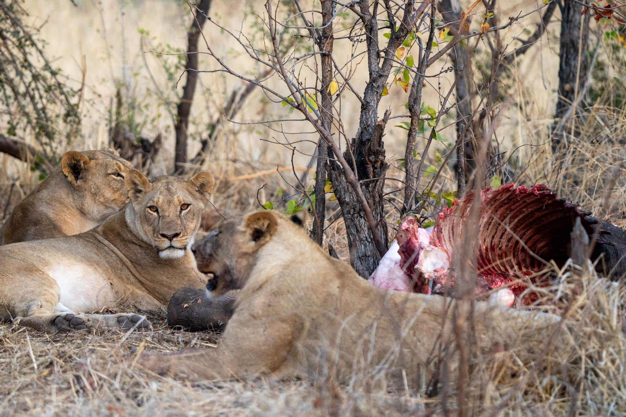 Obwohl es kein ausgewachsener Bulle war, war der Grossteil des Kadavers nach nicht einmal 24 Stunden bereits vertilgt! Das Rudel bewachte den Rest wie einen Schatz und blieb ständig in der Nähe. Hyänen wurden sofort verjagt, und auch die in den umliegenden Bäumen wartenden Geier hatten keine Chance, auch nur ein Stück zu ergattern. Eine derart intensive Sichtung hatten wir noch nie erlebt – vor allem die extreme Fressgeschwindigkeit hat uns sehr beeindruckt.