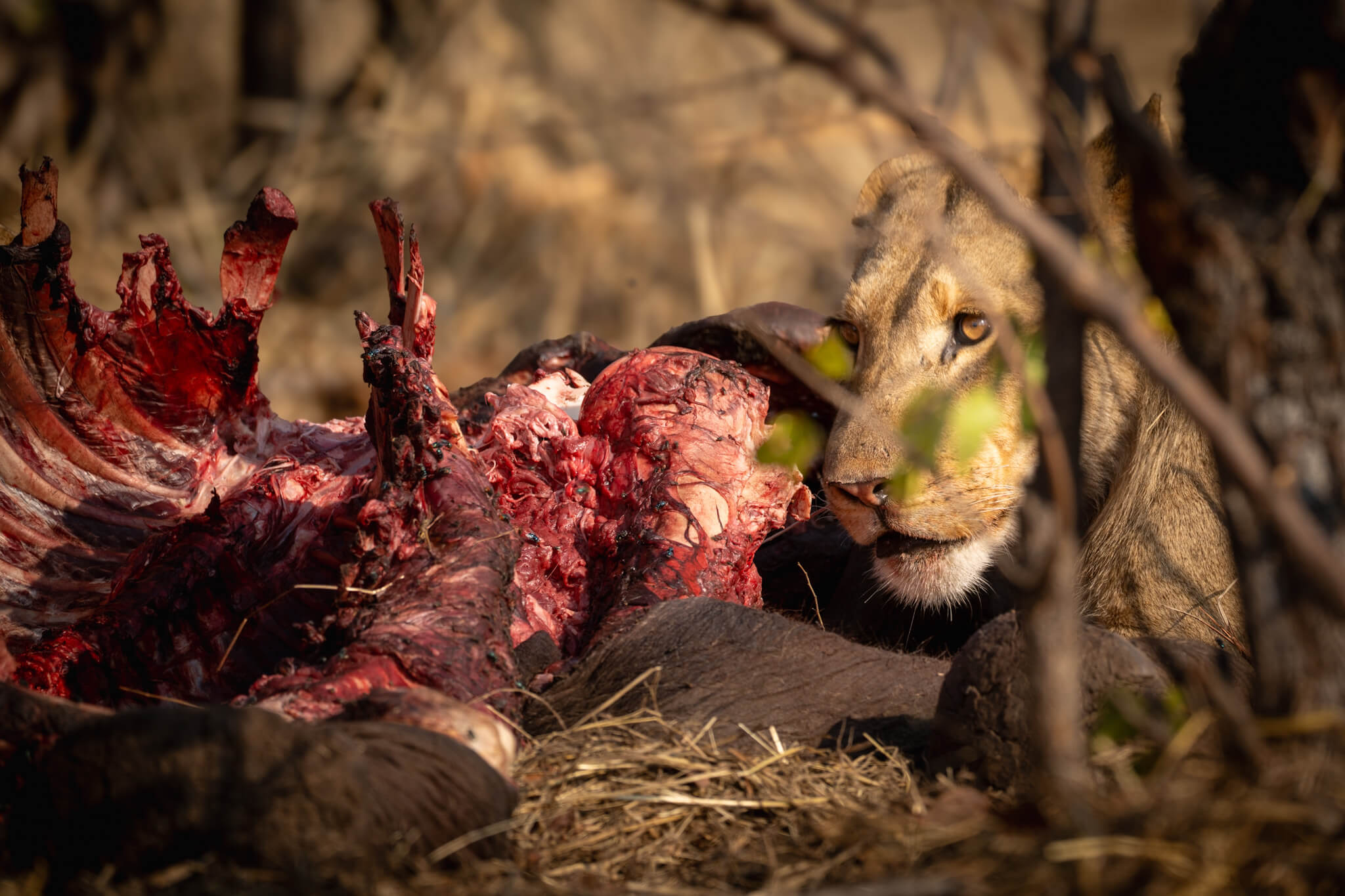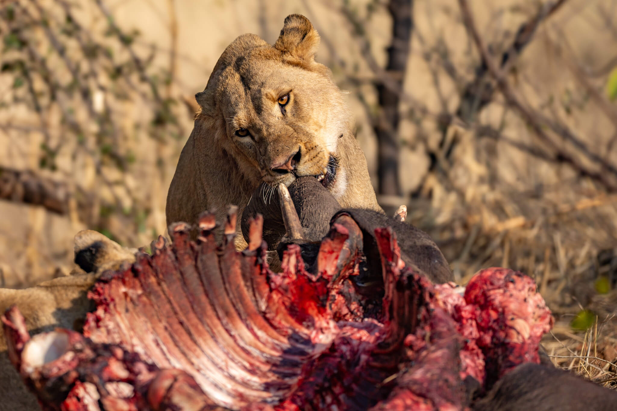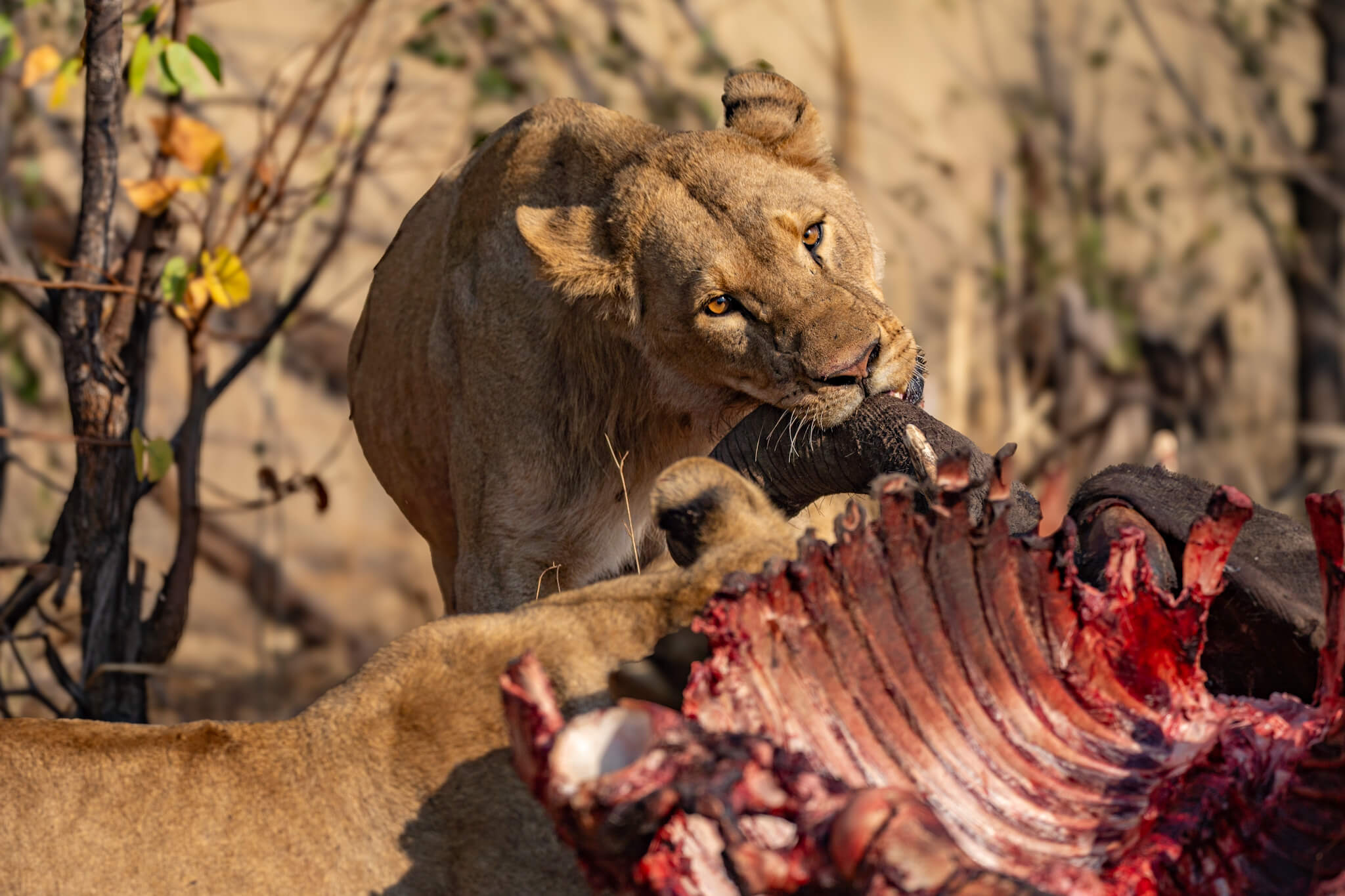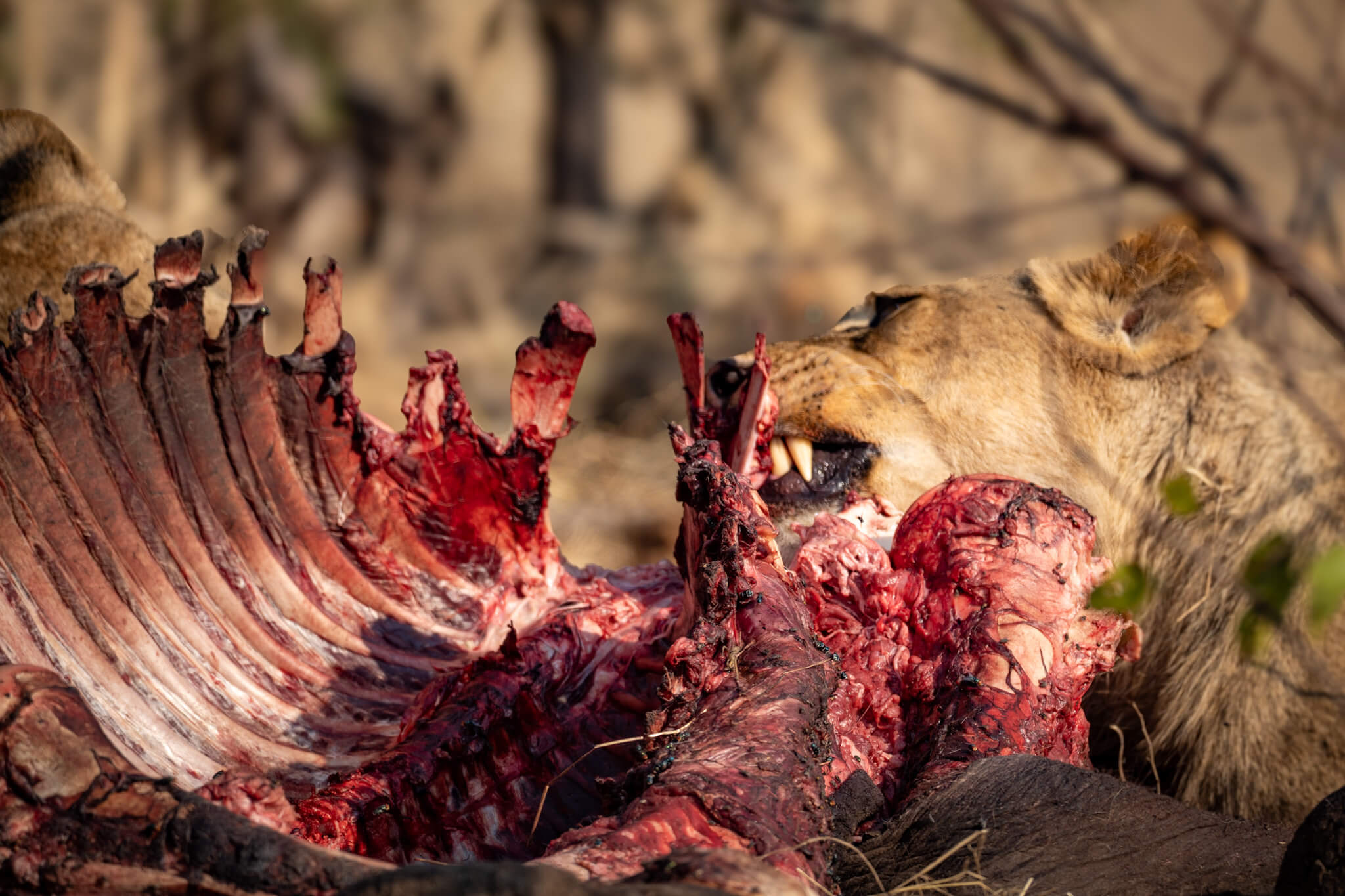 Obwohl es kein ausgewachsener Bulle war, war der Grossteil des Kadavers nach nicht einmal 24 Stunden bereits vertilgt! Das Rudel bewachte den Rest wie einen Schatz und blieb ständig in der Nähe. Hyänen wurden sofort verjagt, und auch die in den umliegenden Bäumen wartenden Geier hatten keine Chance, auch nur ein Stück zu ergattern. Eine derart intensive Sichtung hatten wir noch nie erlebt – vor allem die extreme Fressgeschwindigkeit hat uns sehr beeindruckt.