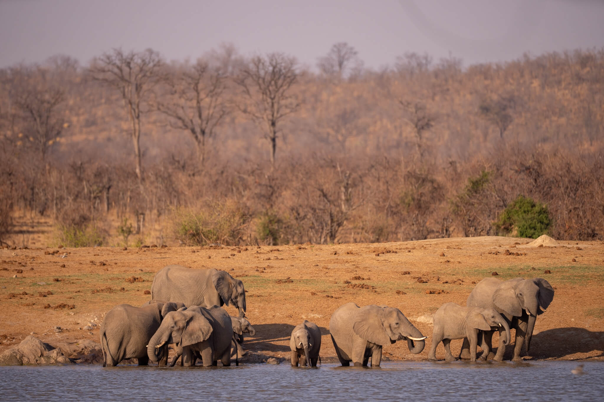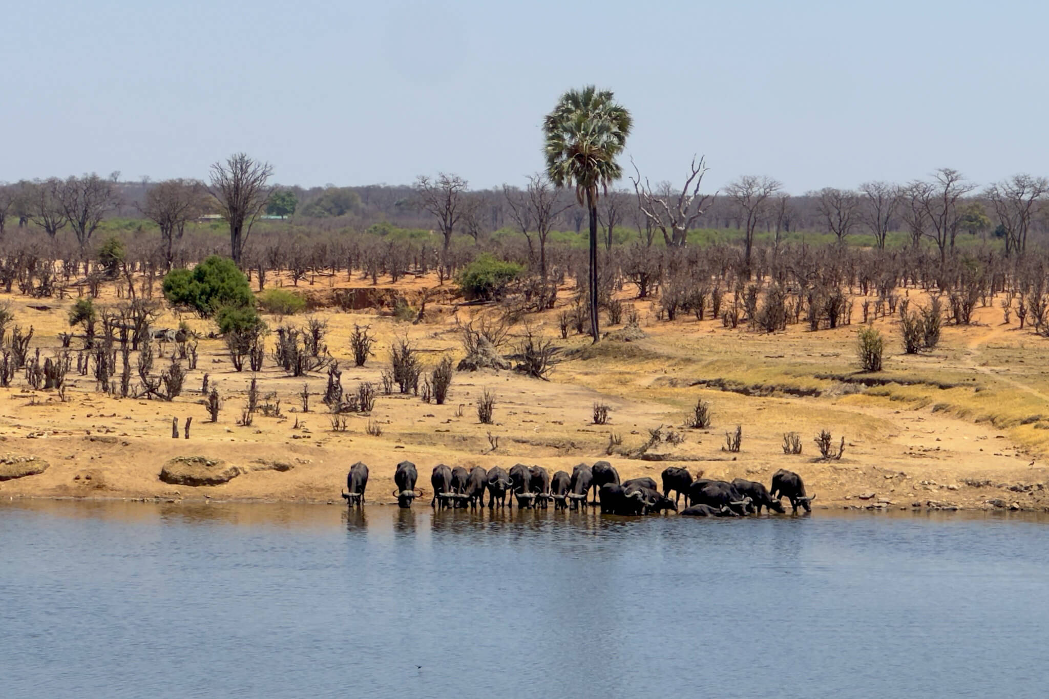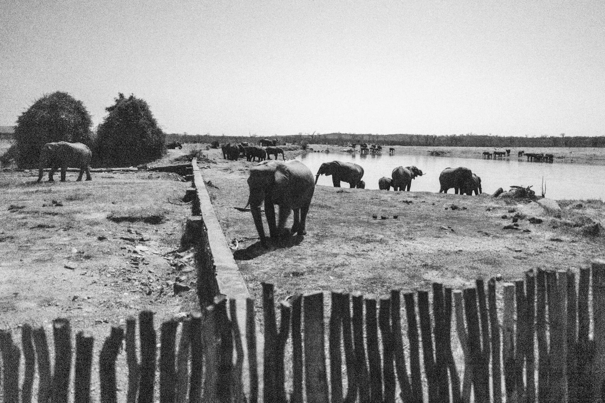 Wir hatten Glück: Eine kleinere Büffelherde und – wie sollte es anders sein – mehrere Elefantenherden kamen ans Wasser. Die badenden, rangelnden und trinkenden Dickhäuter boten wieder einmal ein faszinierendes, kurzweiliges Schauspiel. Am nächsten Morgen gesellten sich noch einige Löwen dazu – so endete unser Hwange-Abenteuer genau so, wie es begonnen hatte. Glücklich und zufrieden fuhren wir zum Main Camp und verliessen von dort den Park. Über die – mit Abstand – schlechteste Straße Simbabwes ging es nach Bulawayo. Dort machten wir Rast, stockten die Vorräte auf und starteten Richtung nächstes Ziel: das Warthogs Bush Camp am Lake Kariba.