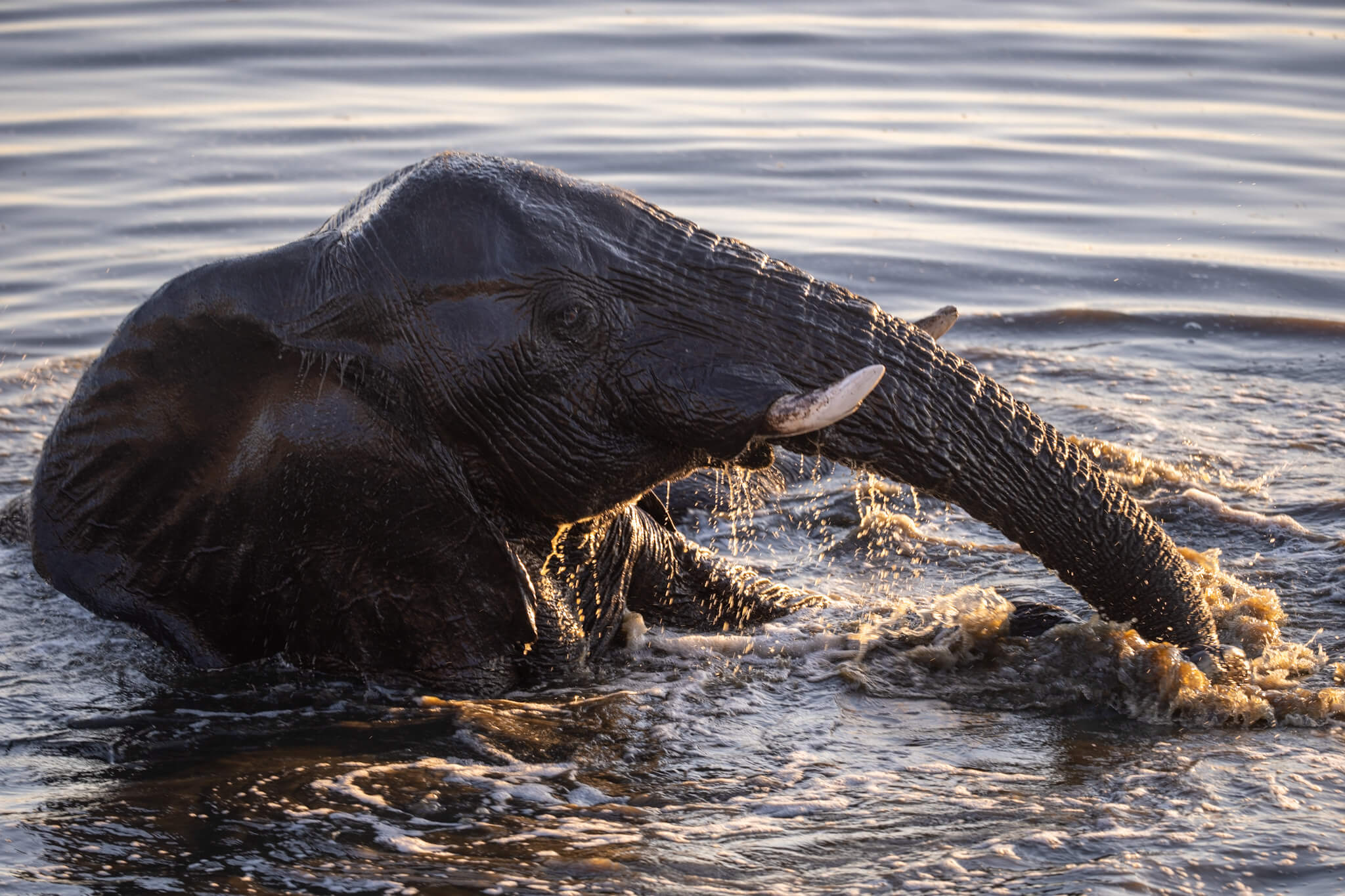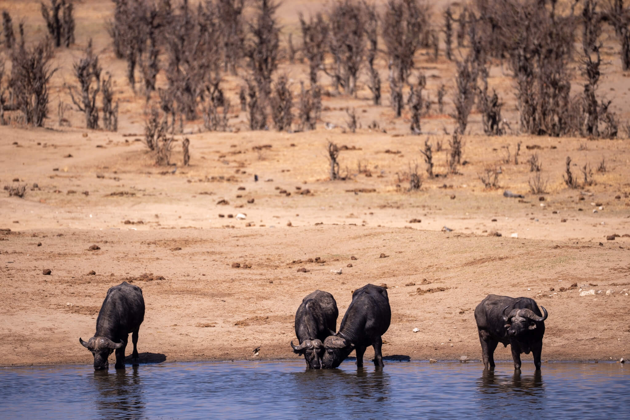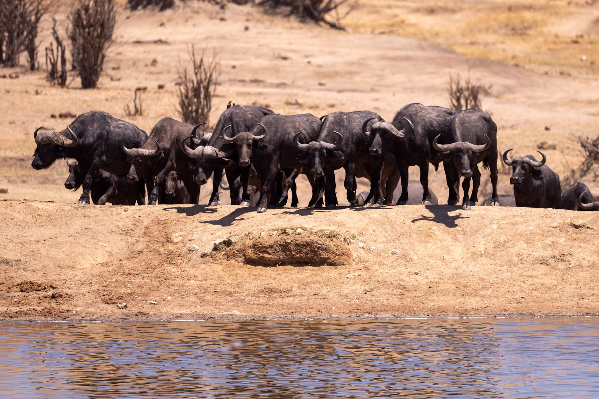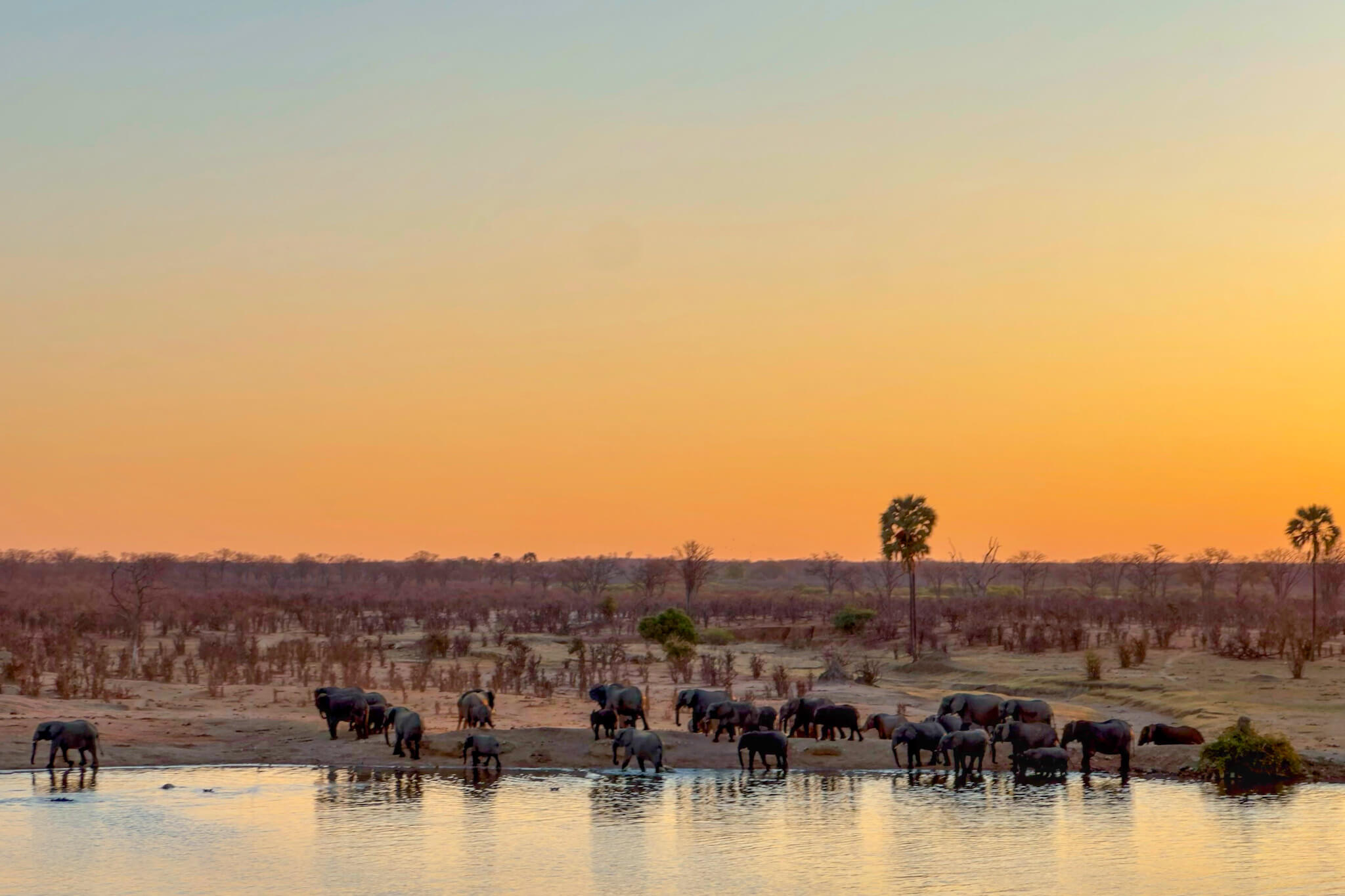Wir hatten Glück: Eine kleinere Büffelherde und – wie sollte es anders sein – mehrere Elefantenherden kamen ans Wasser. Die badenden, rangelnden und trinkenden Dickhäuter boten wieder einmal ein faszinierendes, kurzweiliges Schauspiel. Am nächsten Morgen gesellten sich noch einige Löwen dazu – so endete unser Hwange-Abenteuer genau so, wie es begonnen hatte. Glücklich und zufrieden fuhren wir zum Main Camp und verliessen von dort den Park. Über die – mit Abstand – schlechteste Straße Simbabwes ging es nach Bulawayo. Dort machten wir Rast, stockten die Vorräte auf und starteten Richtung nächstes Ziel: das Warthogs Bush Camp am Lake Kariba.